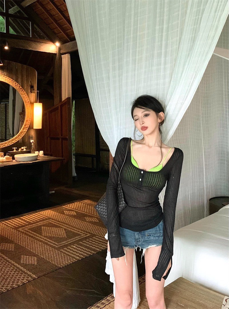 Apr. 疊搭純欲性感 透視感U領上衣 螢光色系吊帶