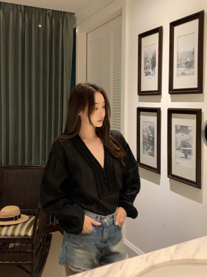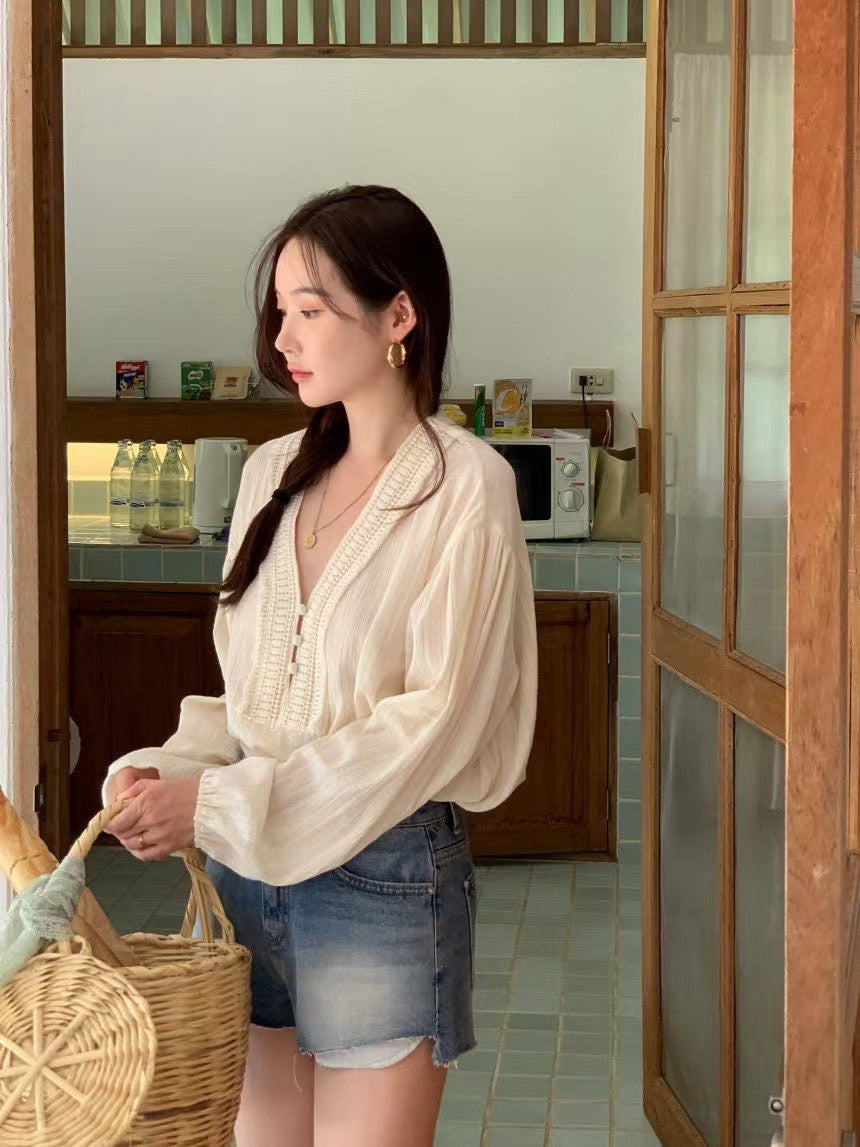 Aug. 波西米娃娃衫V領慵懶肌理紋上衣 米色/黑色