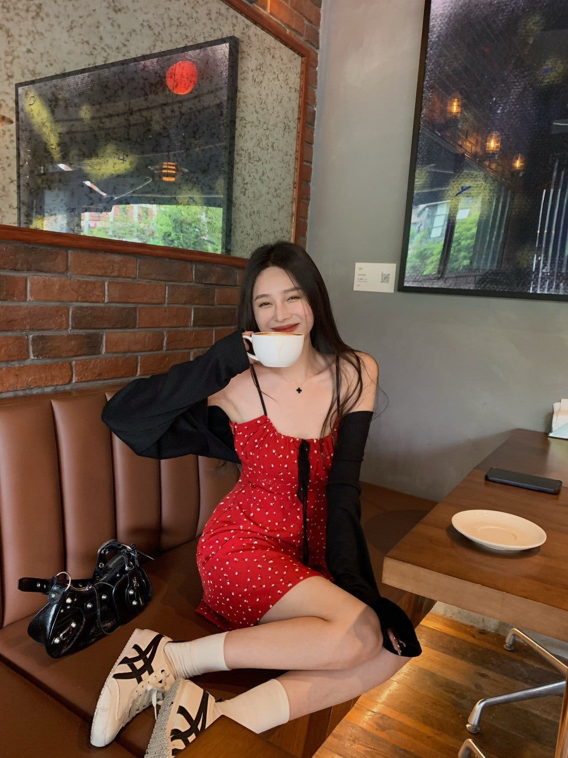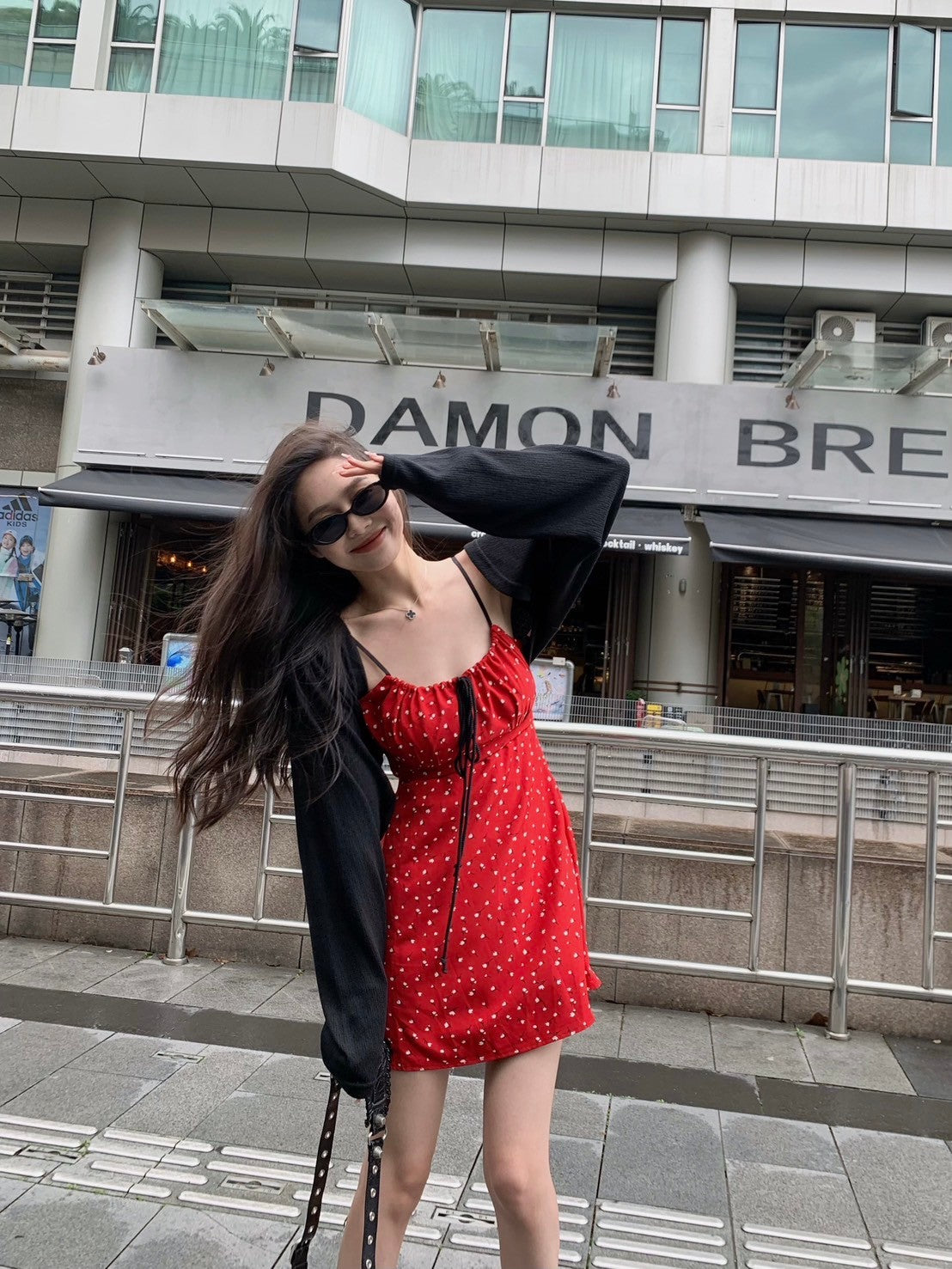 Aug. 甜櫻萊姆撞色顯瘦連身裙 黑色開衫