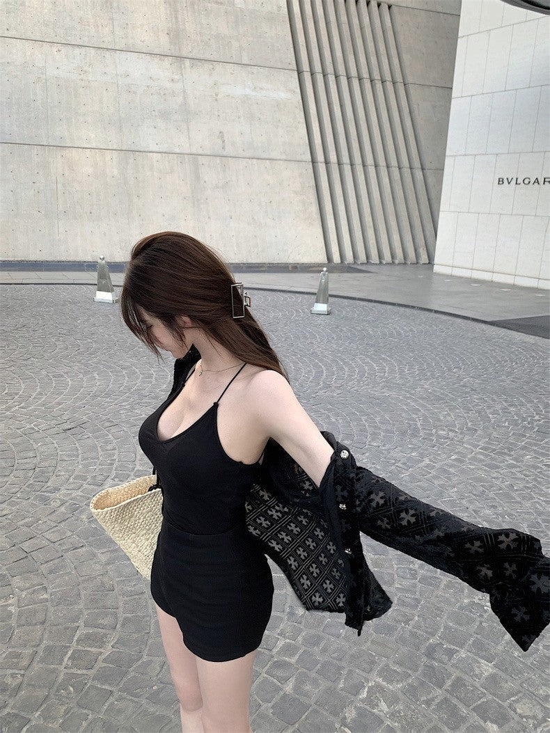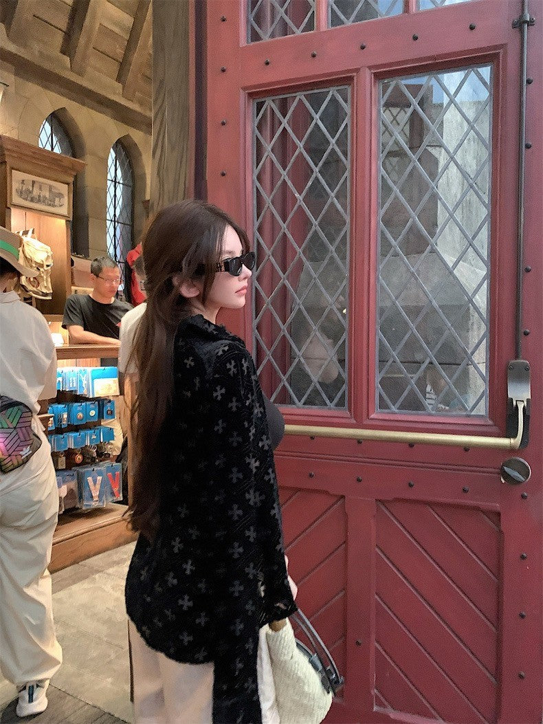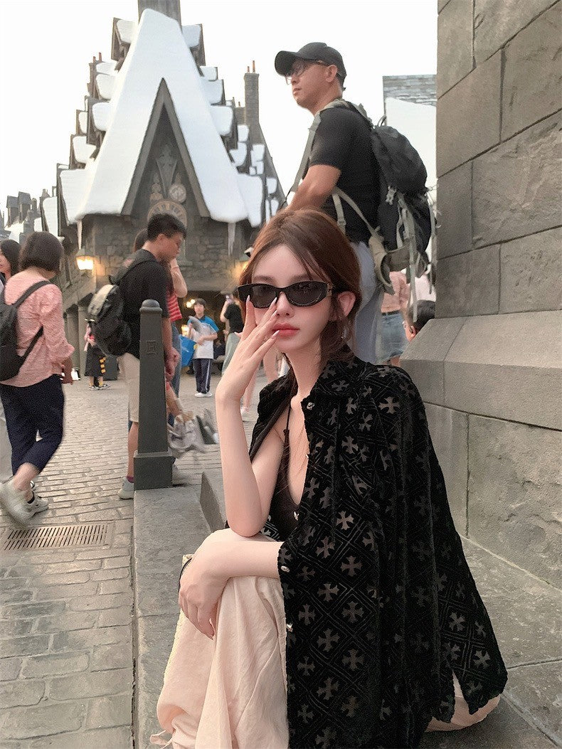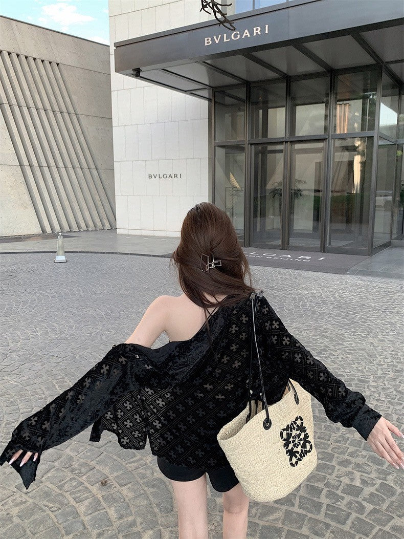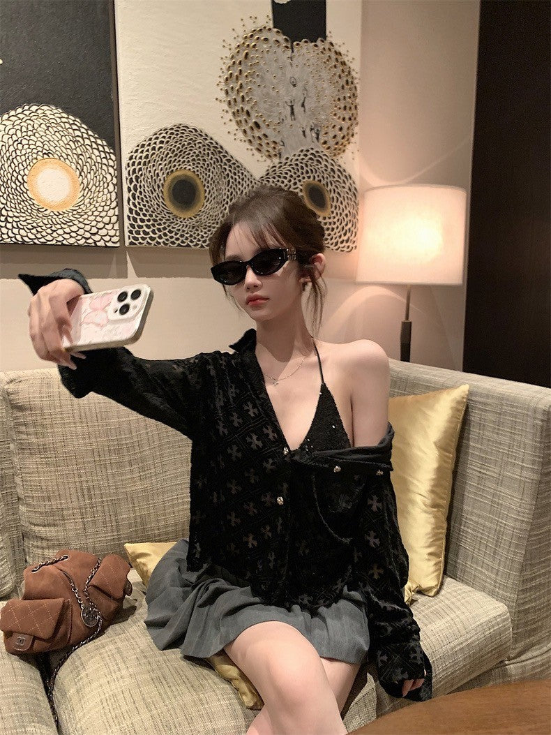 Aug. 神秘腔調 縷空十字架設計 絲絨感襯衫 黑色