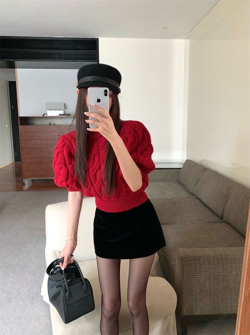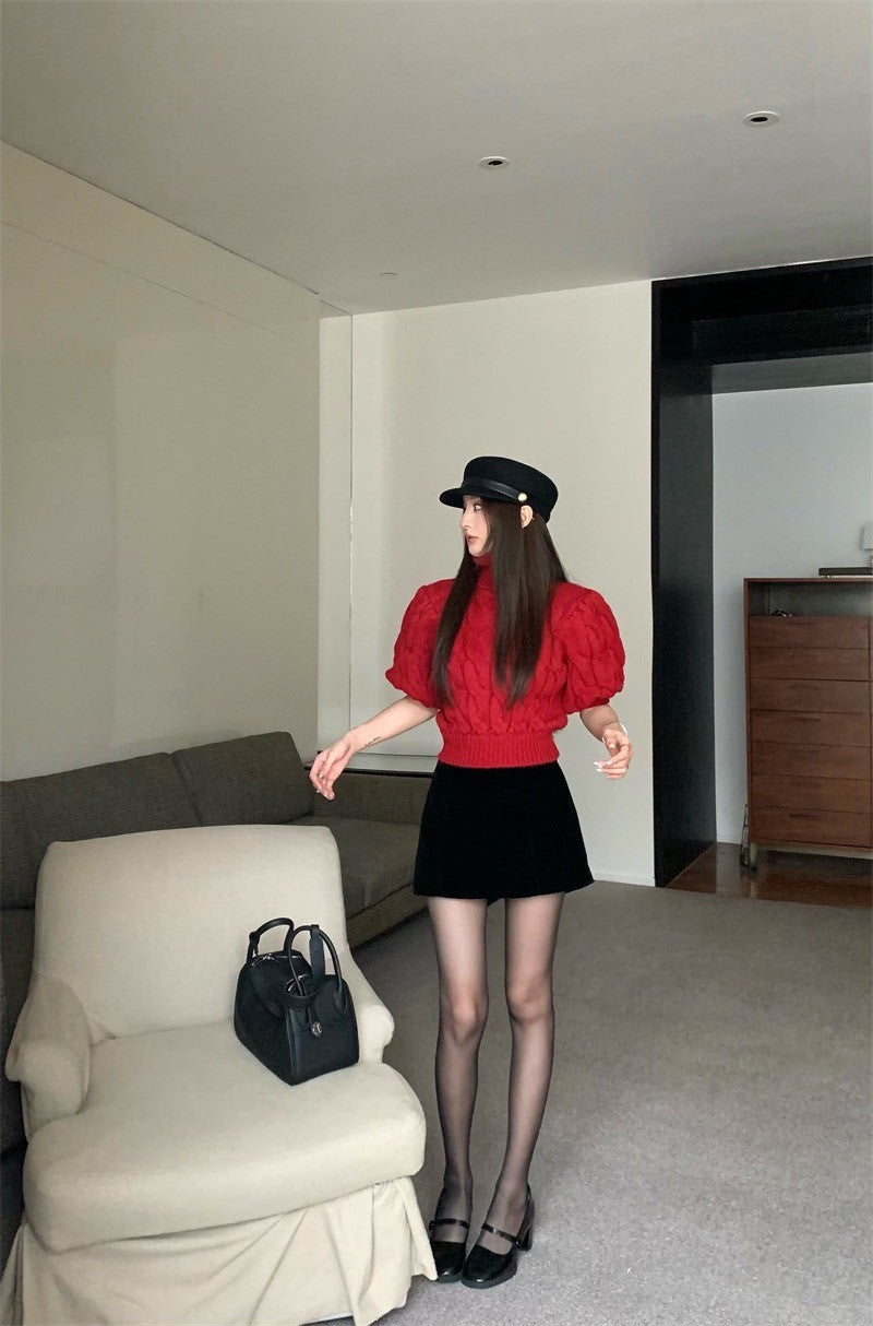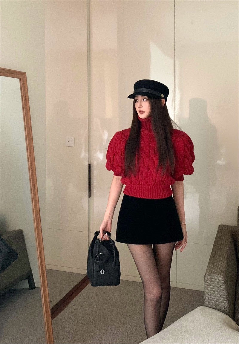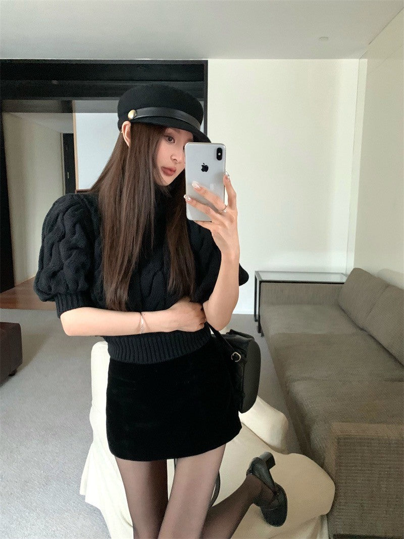 Feb. 俄羅斯娃娃 泡泡袖高領五分袖針織上衣 黑色A字裙