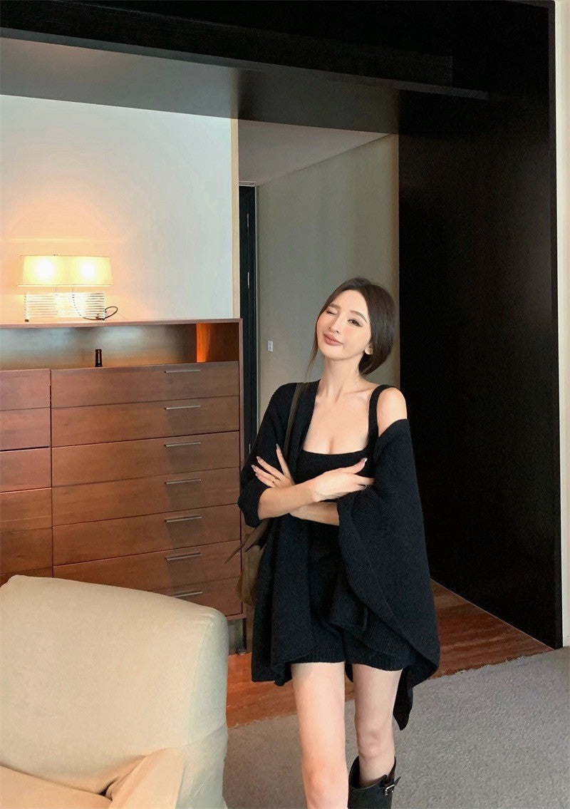 Feb. 溜灣套裝 氣質披肩背心短褲針織三件套 黑