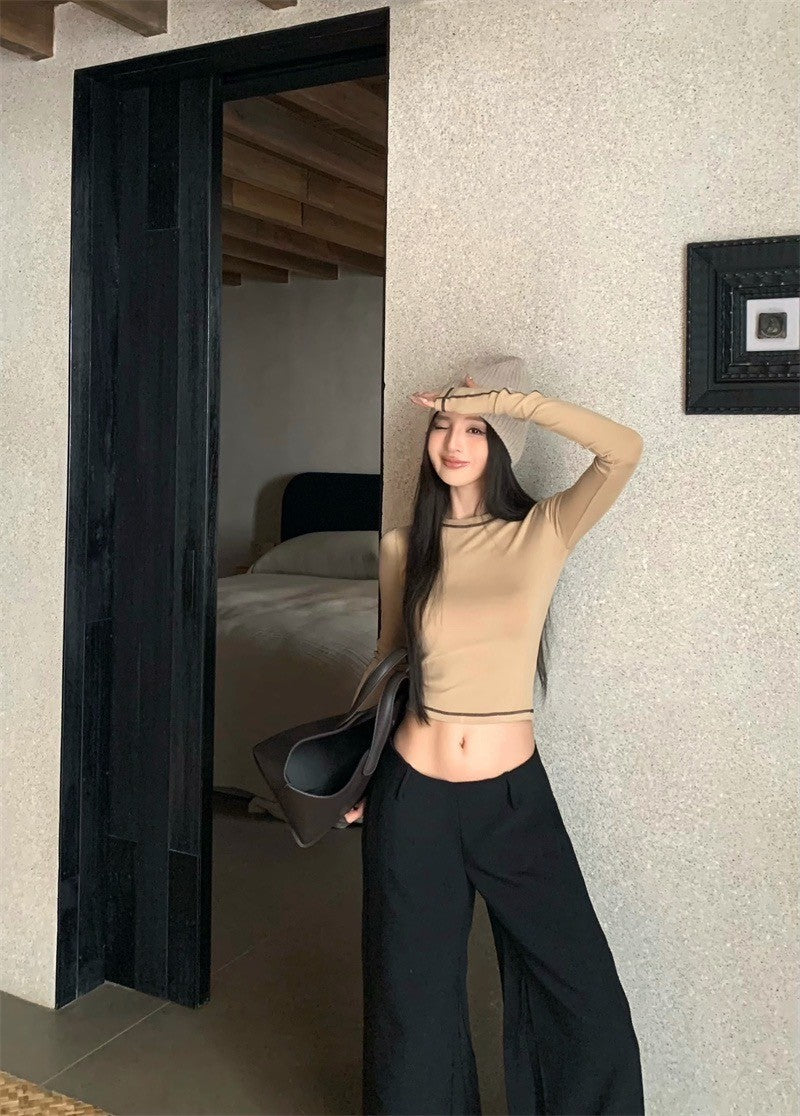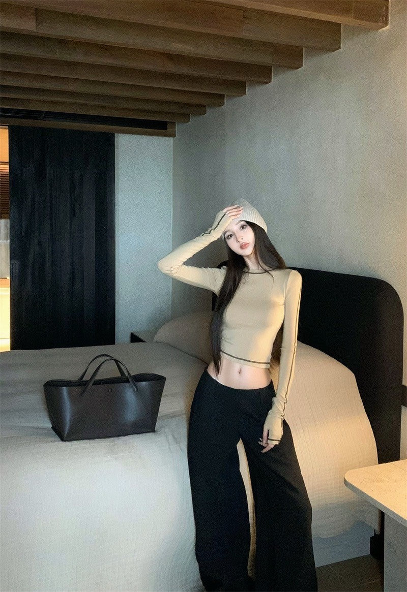 Jan. 休閒高圓領彈力明線設計感上衣 咖