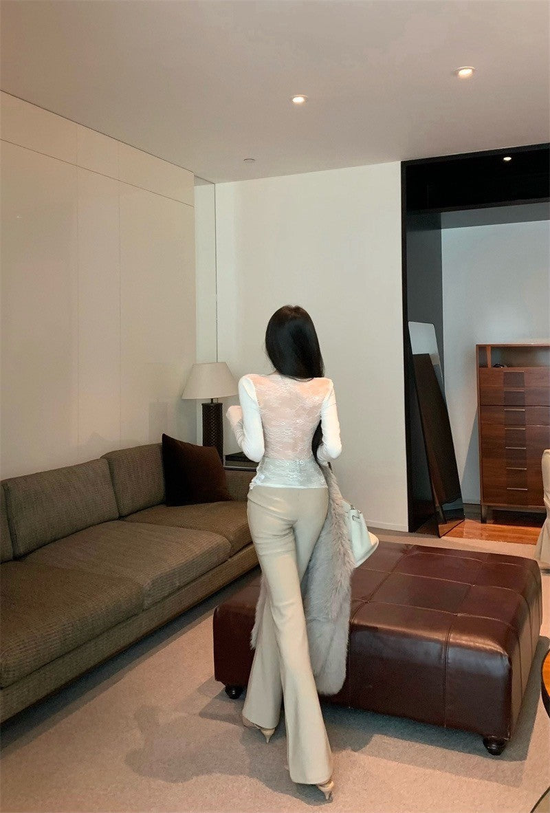 Jan. 辣妹性感露背蕾絲U領上衣 米白