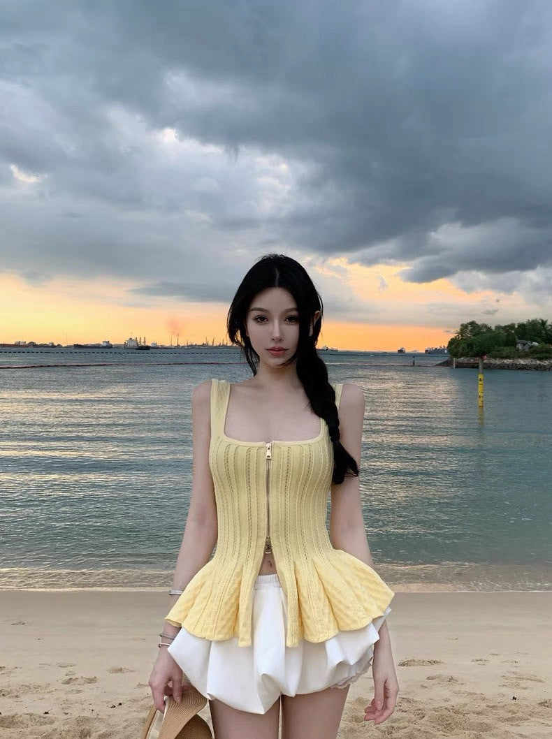 Jun. 休閒芭蕾 方領顯瘦收腰花瓣針織背心 黃