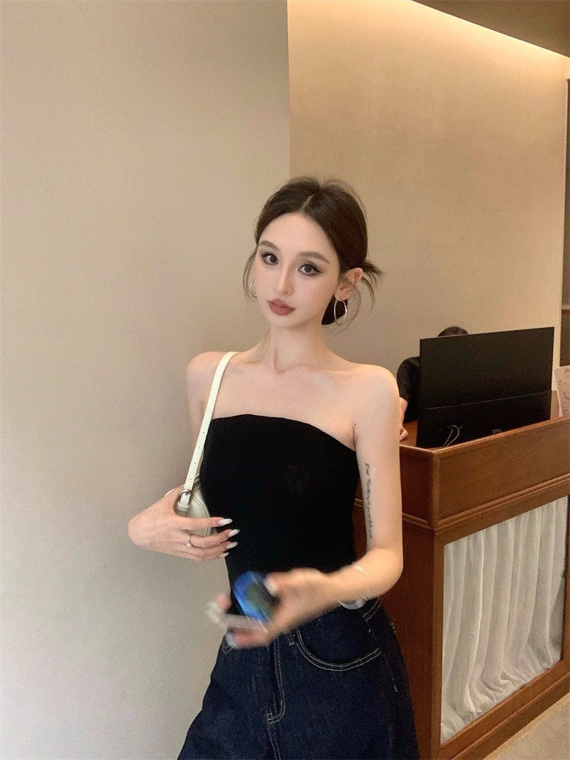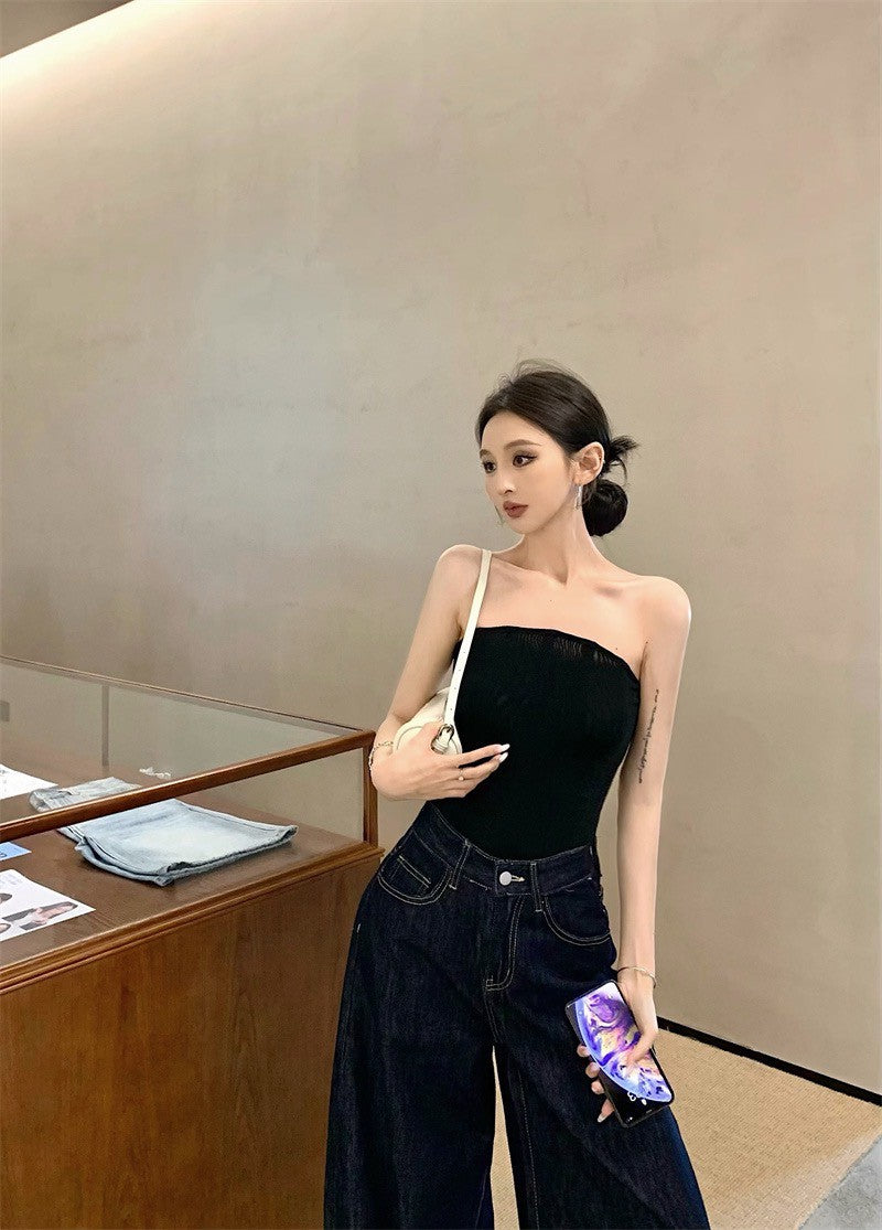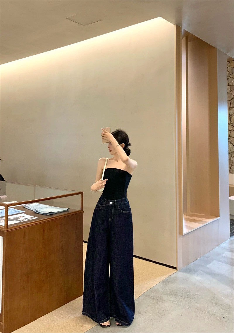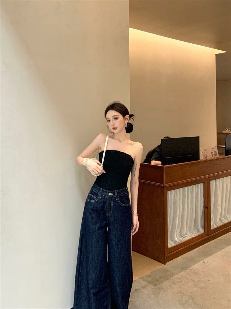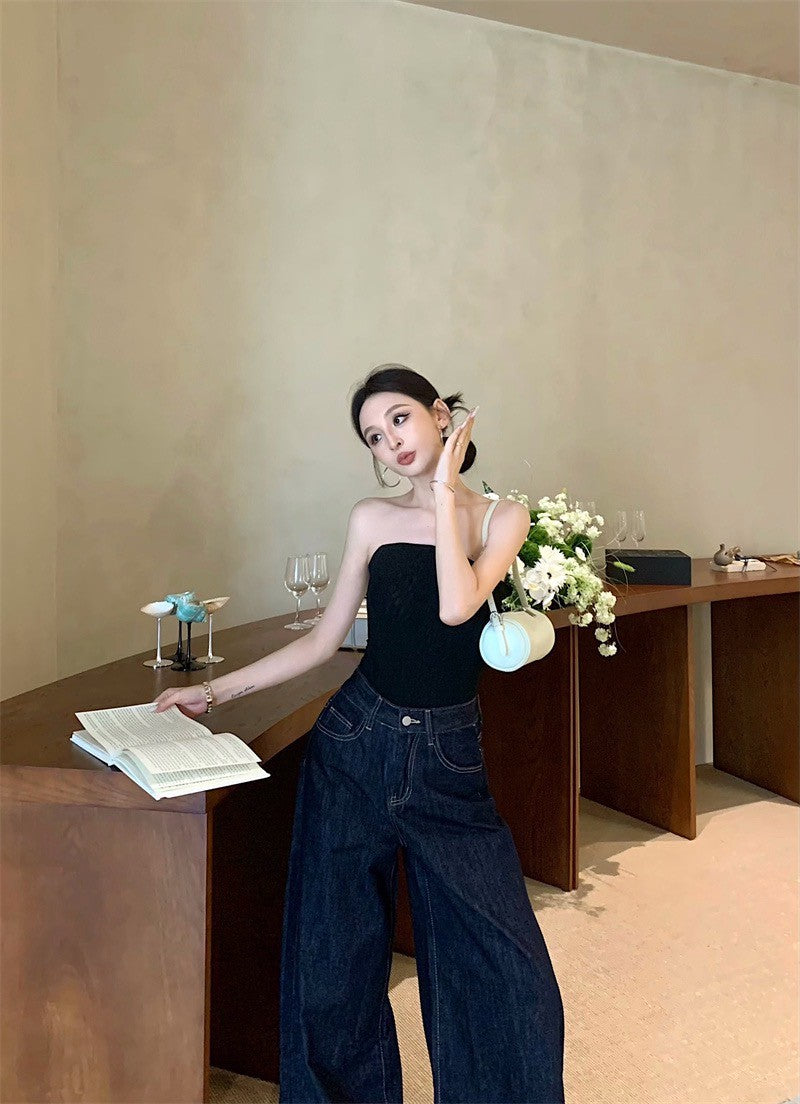 Jun. 古典攻略 魚骨曲線修身抹胸 黑 遮胯寬顯瘦高腰牛仔褲