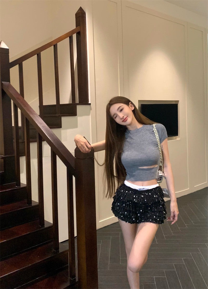 Jun. 圓領顯瘦縷空小心機針織上衣 亞力山中腰亮片褲