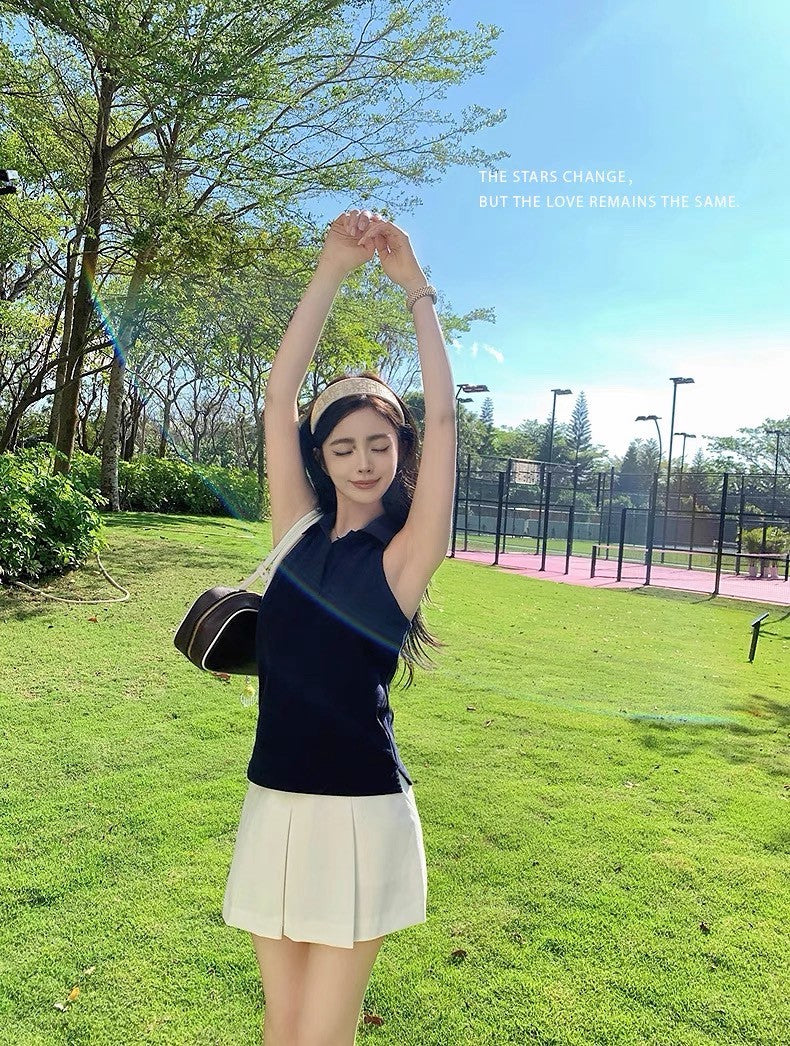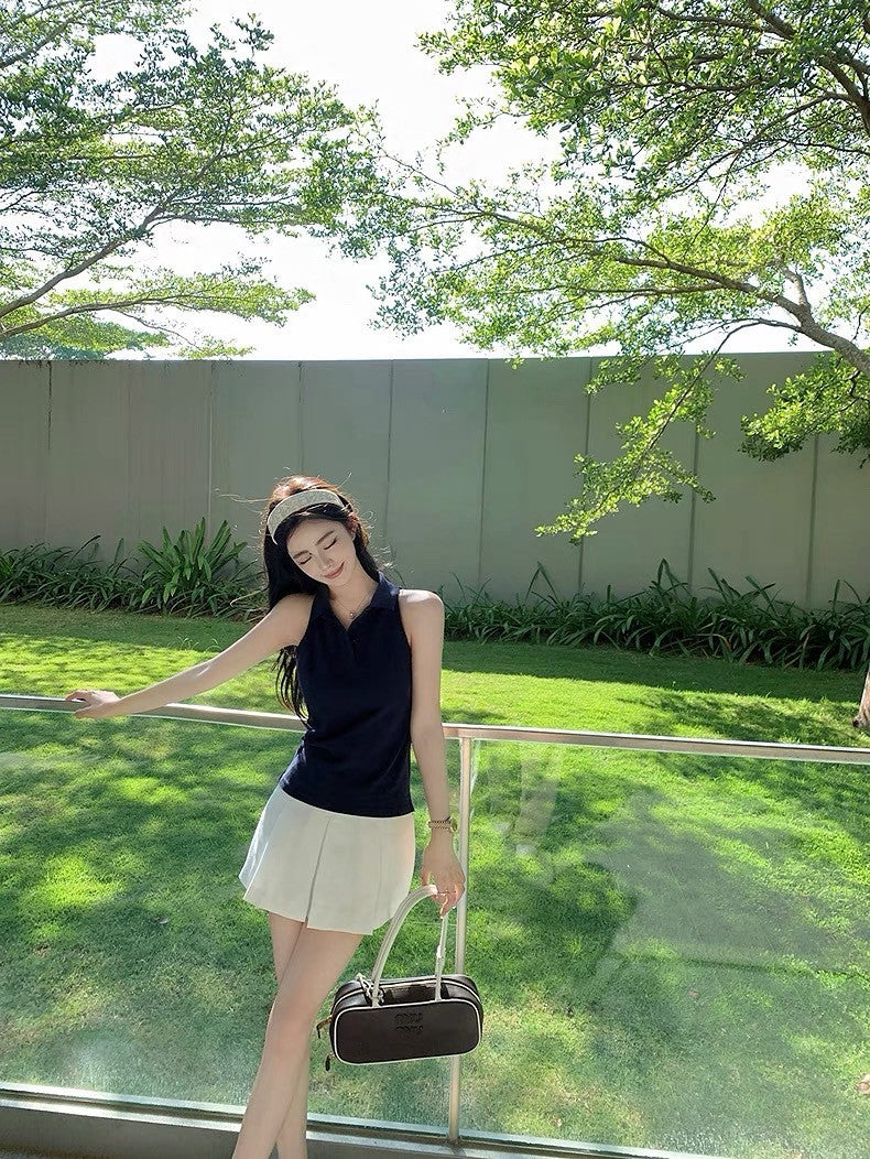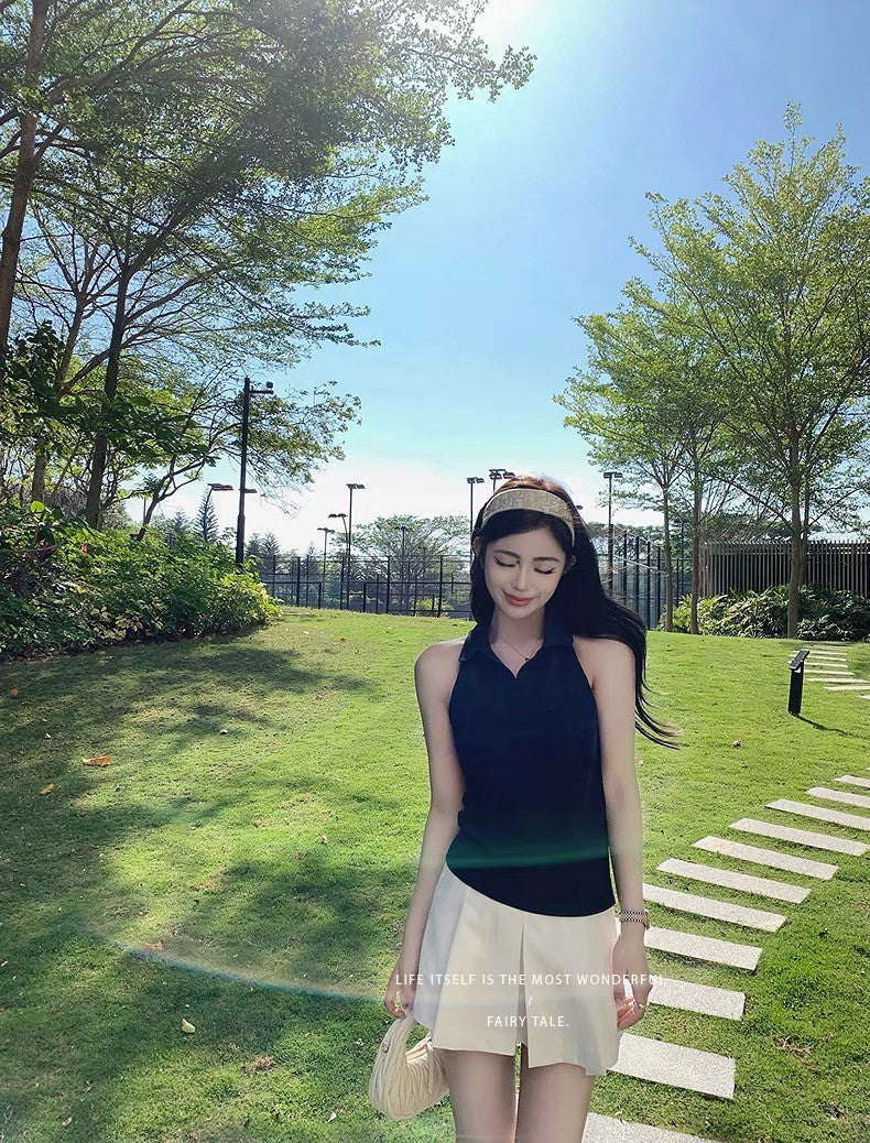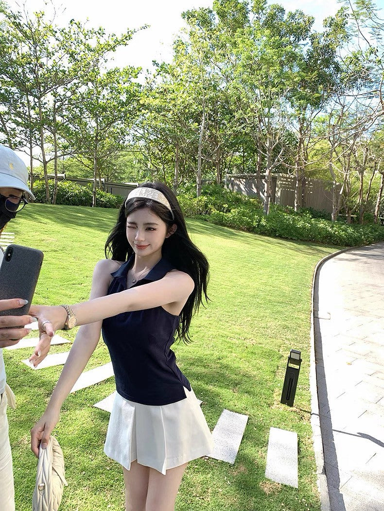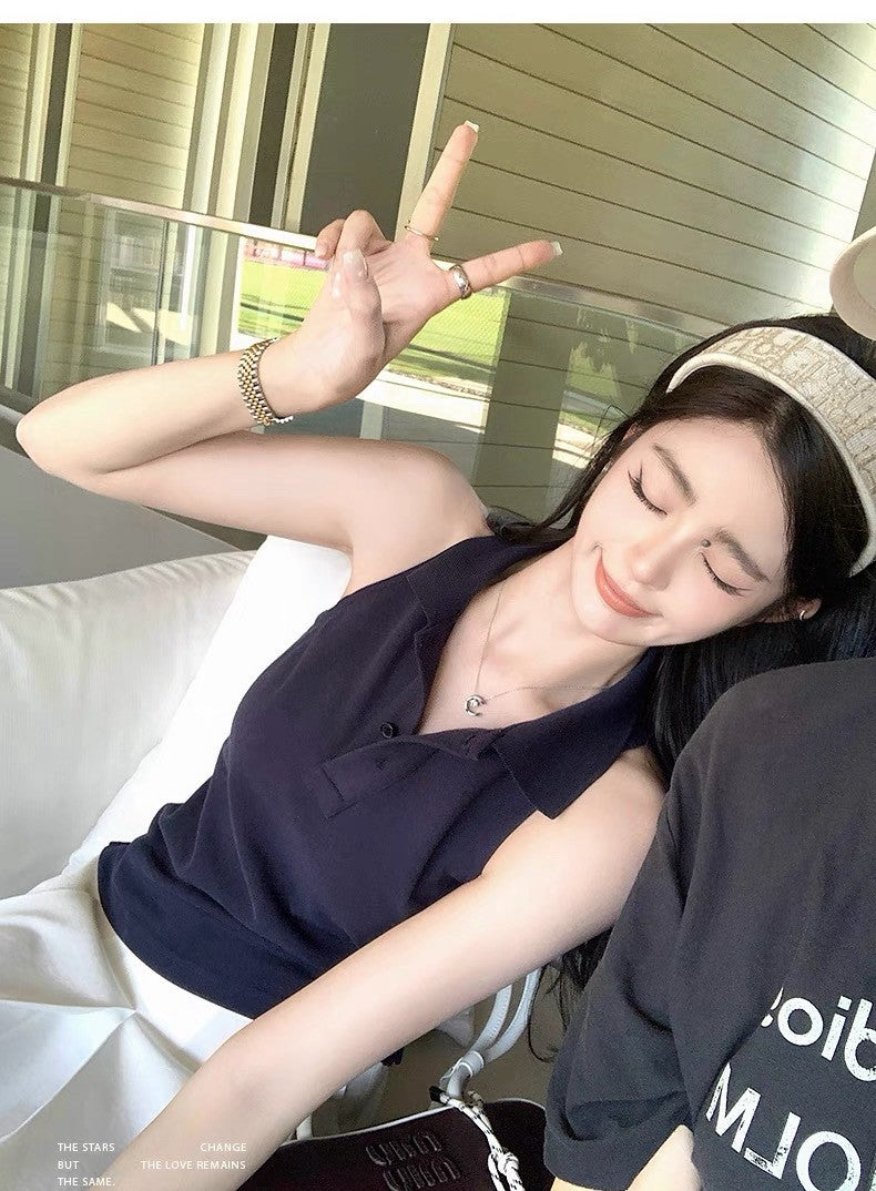 Jun. 大膽穿韓系學院polo領好版型無袖鈕扣背心 藍