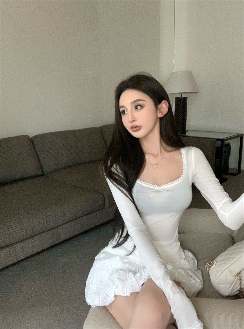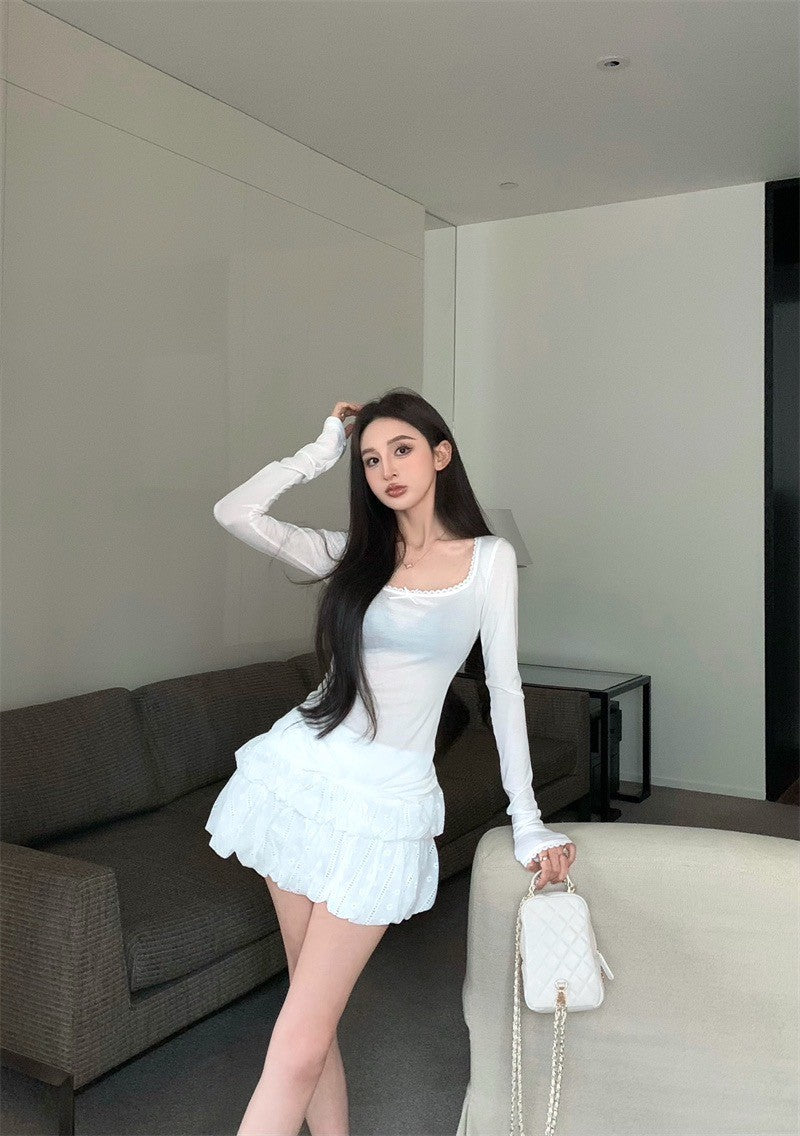 Jun. 奶椰泡泡 薄款芭蕾風打底上衣 花苞半身裙 白