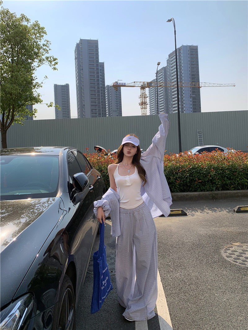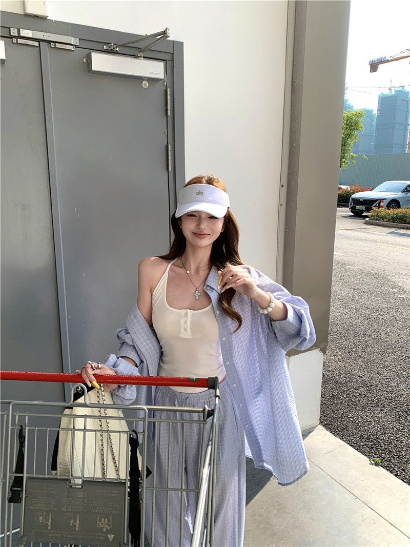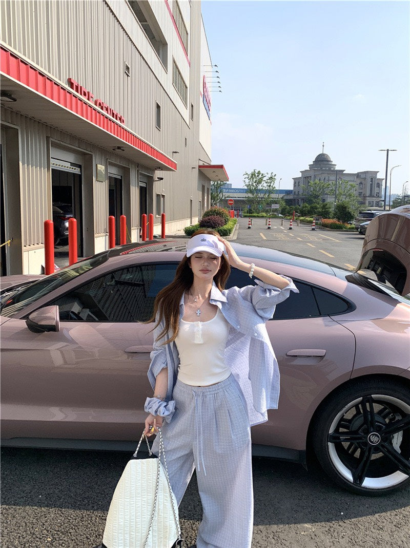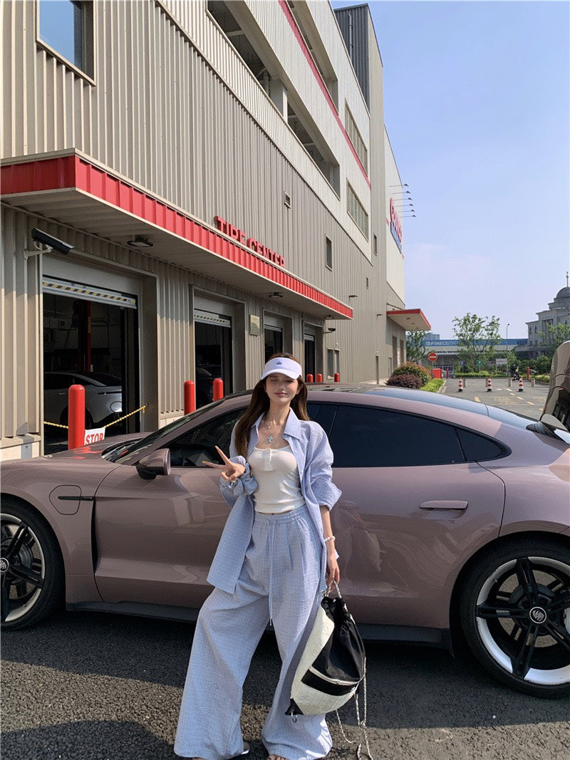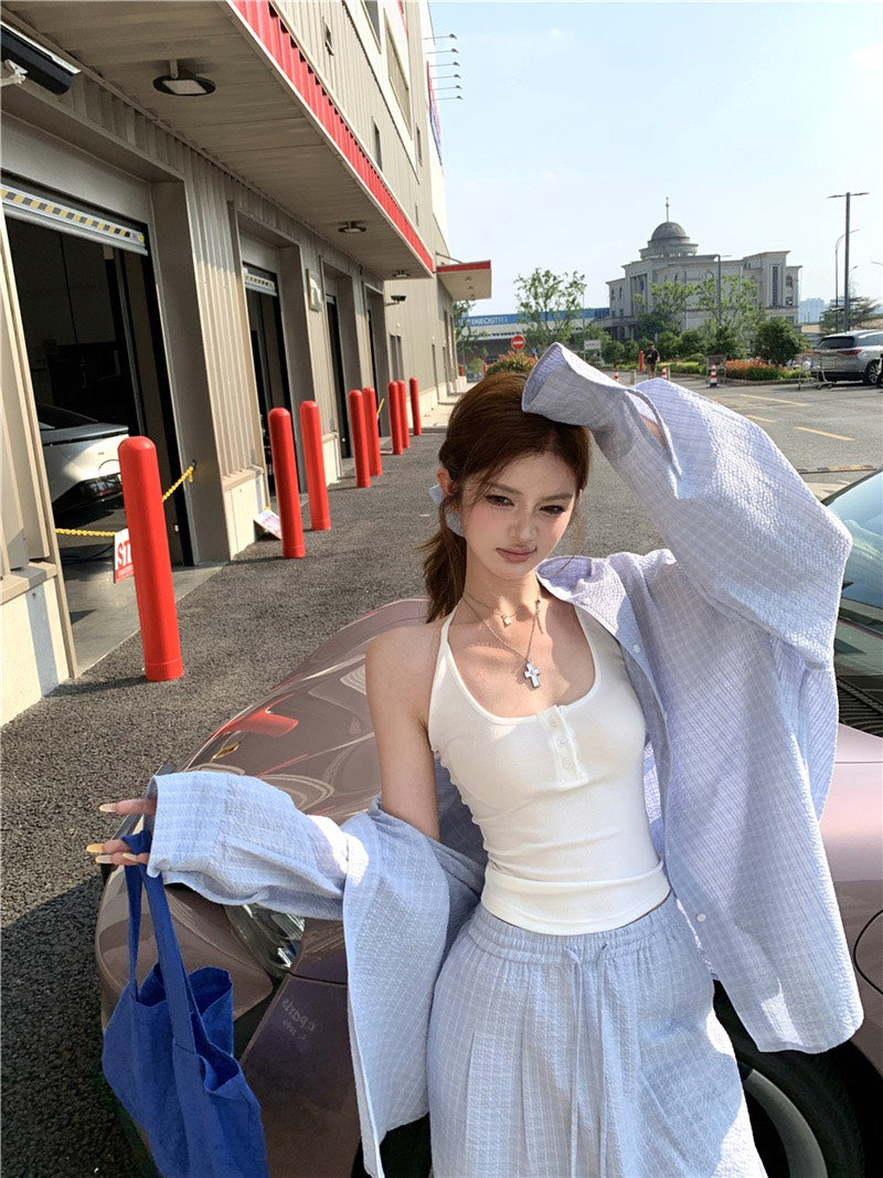 Jun. 奶藍泡芙休閒輕氧格紋襯衫 同花紋休閒褲 淺藍格紋