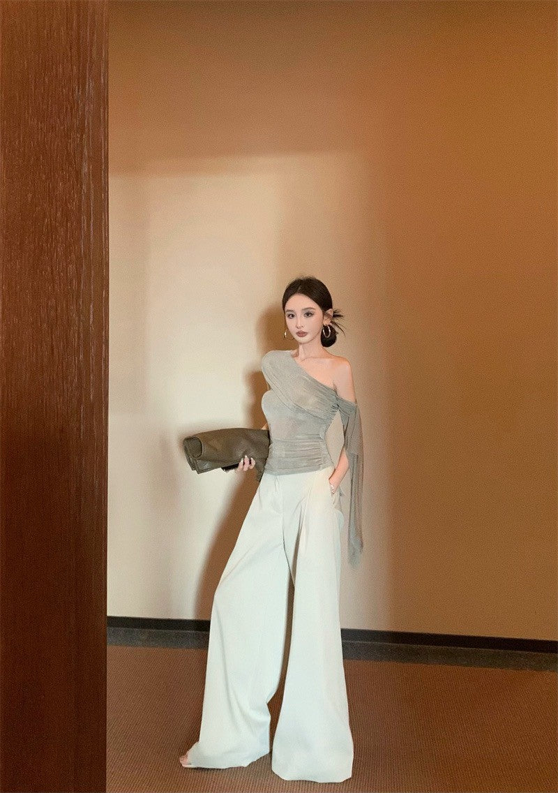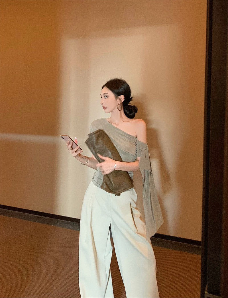 Jun. 姐系高智 單肩飄帶彈力上衣 時髦簡約休閒褲 杏