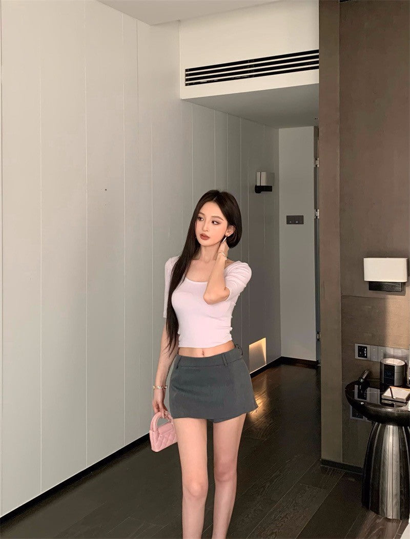 Jun. 日美氣質 修身大U領中袖上衣 淺粉紫 低腰側拉鍊褲裙 灰色褲裙