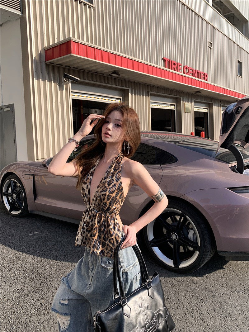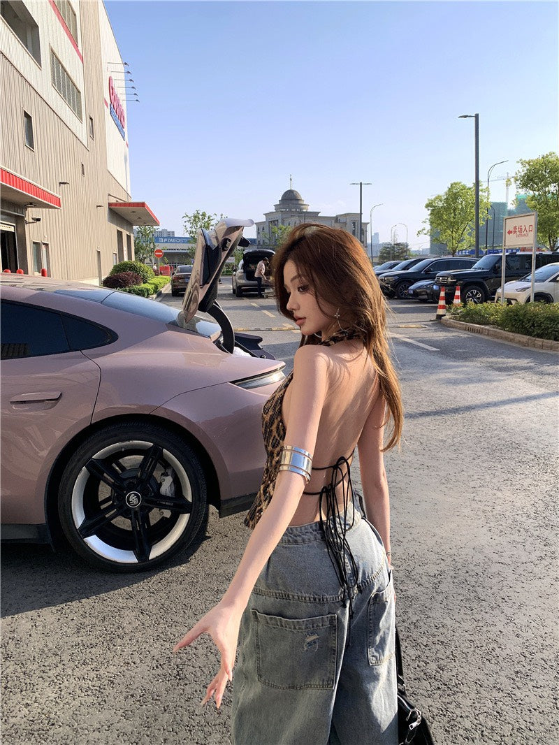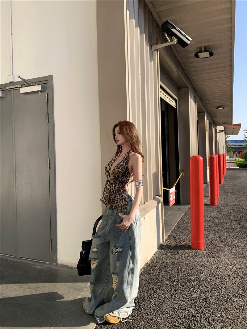 Jun. 曼谷city辣妹花紋亮片露背上衣 不規則刷破闊腿牛仔褲