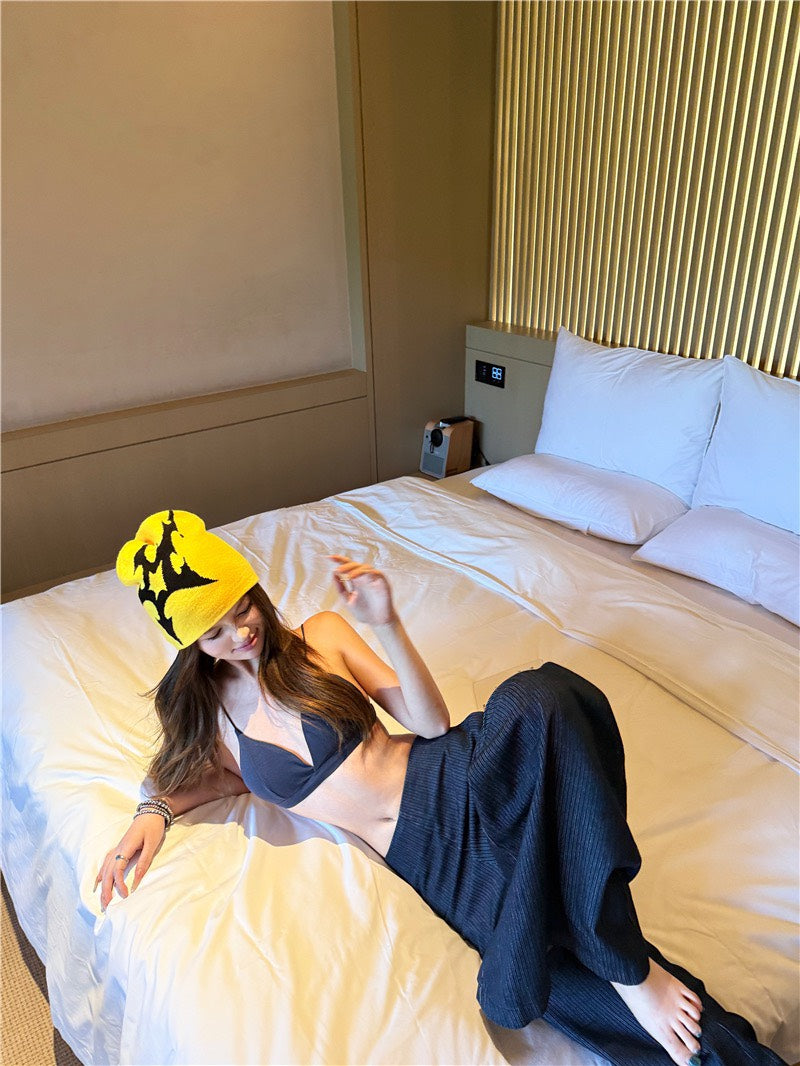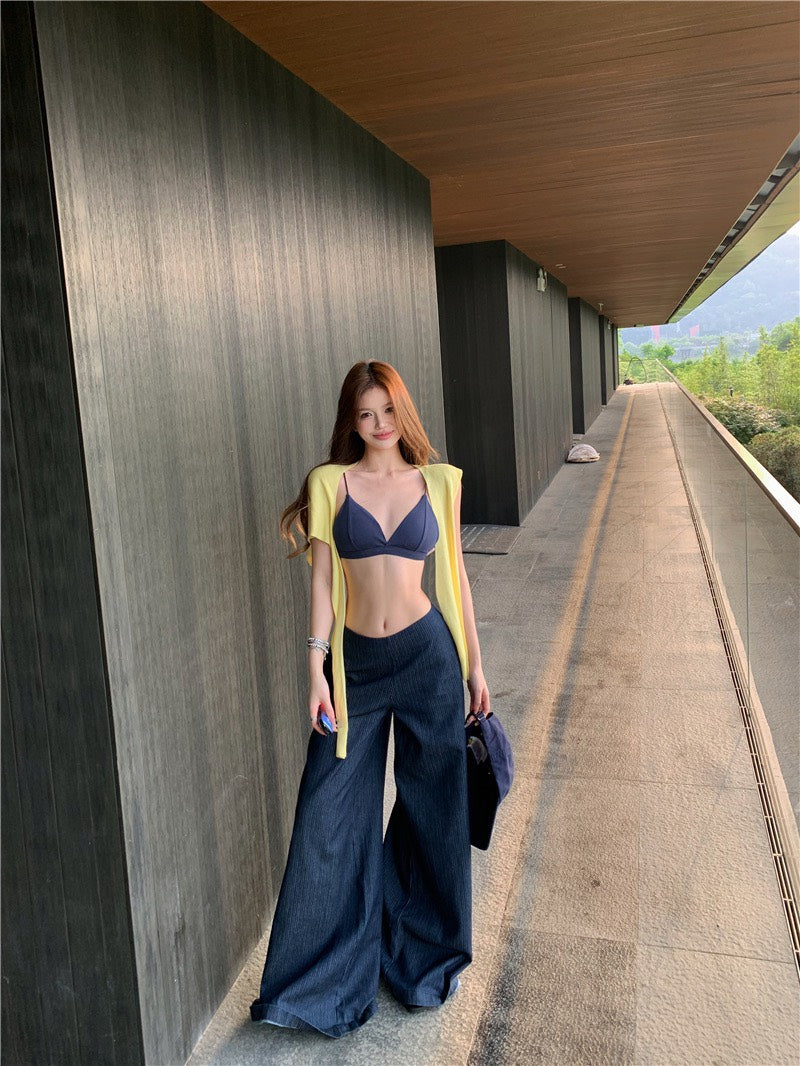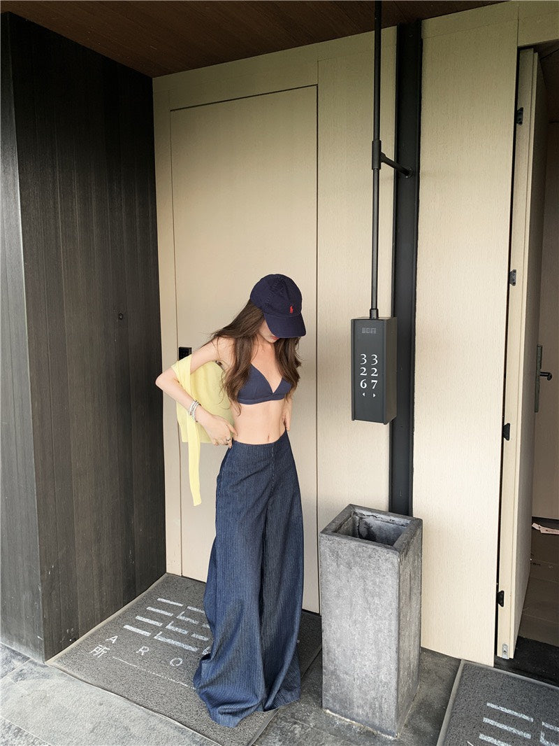Jun. 清爽度假 辣妹肌理紋比基尼 高腰休閒褲 深藍色