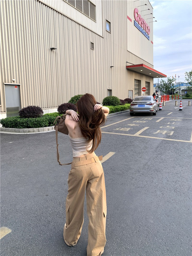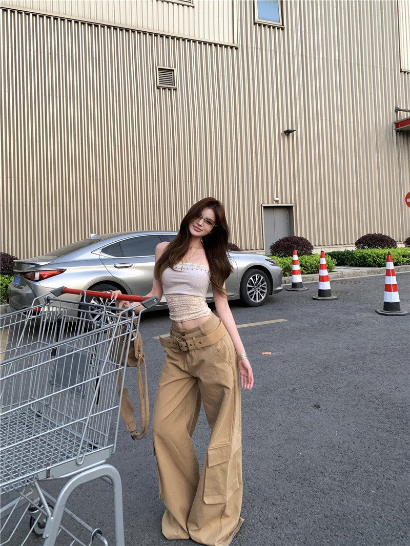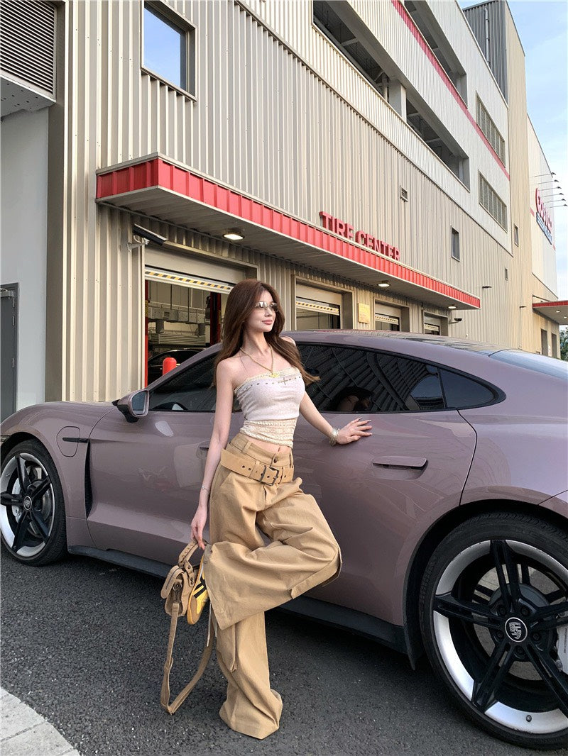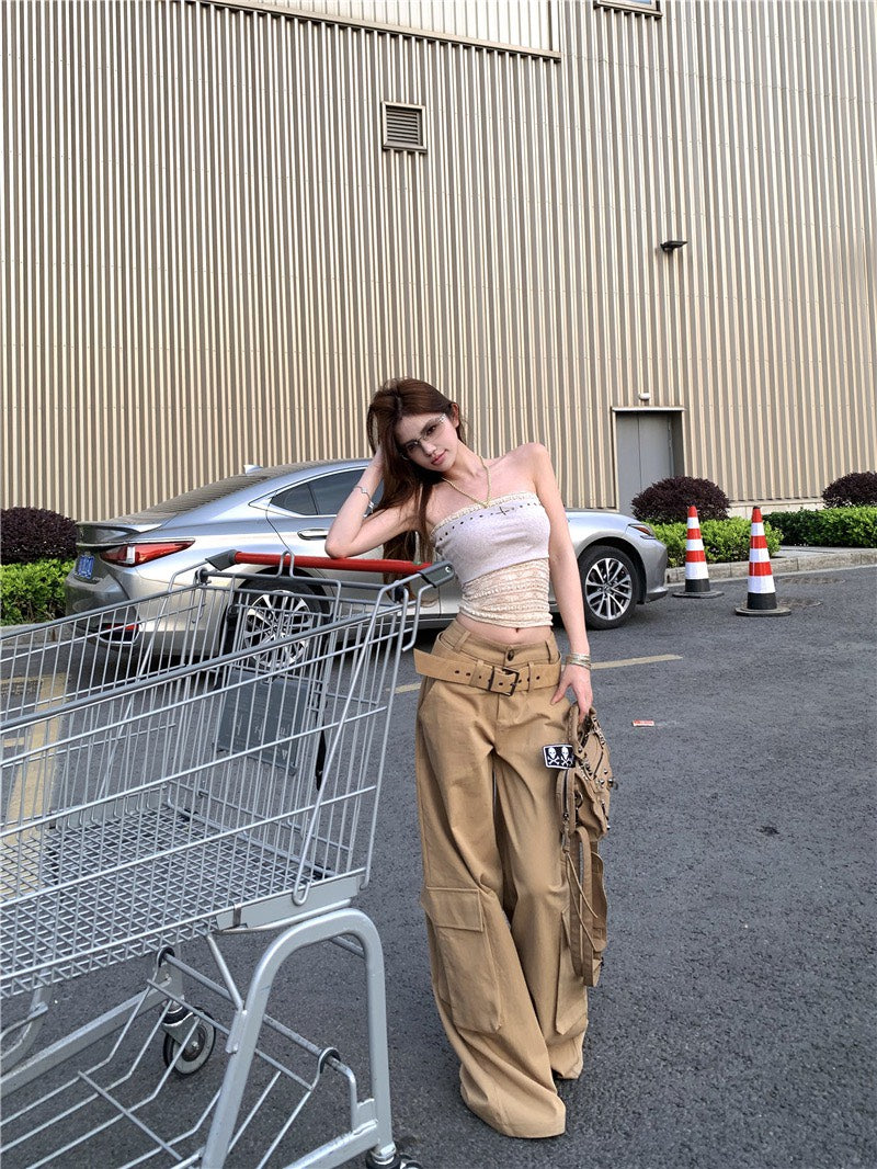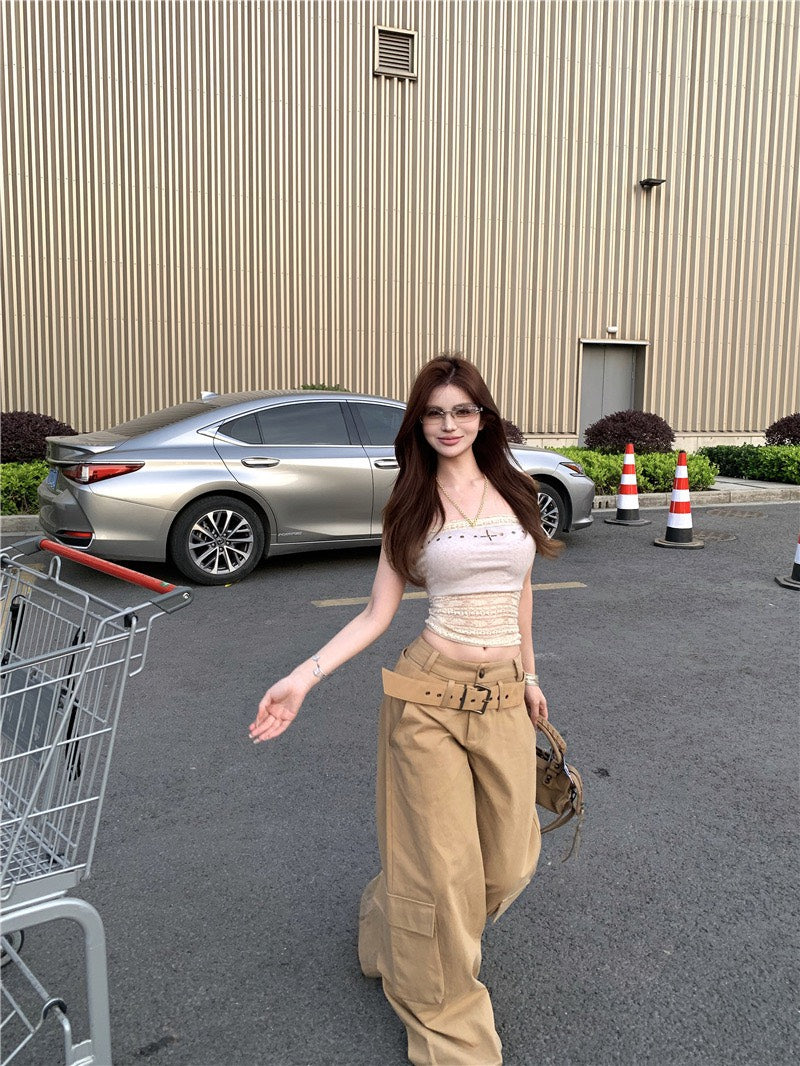 Jun. 痞甜陷阱真兩件式疊穿蕾絲抹胸 卡其工裝休閒褲