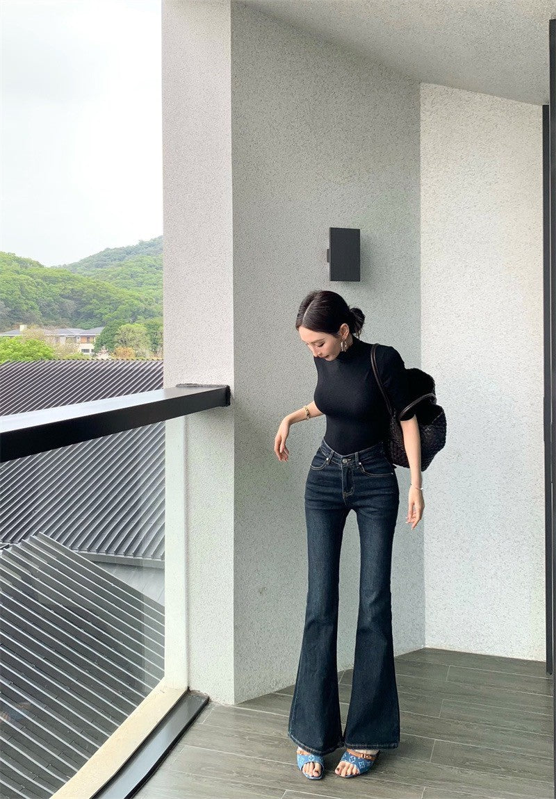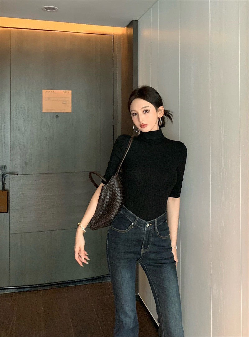 Jun. 穿不膩簡約高領五分袖彈力上衣 紅/黑 顯瘦喇叭褲