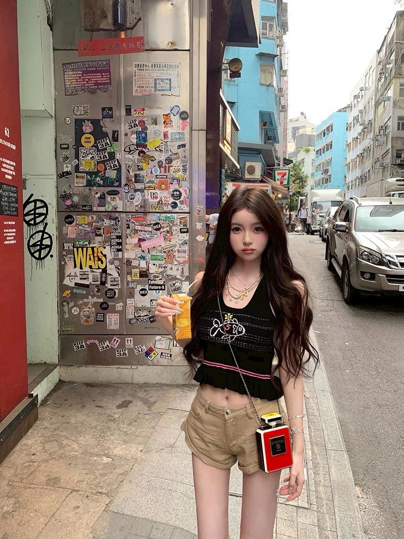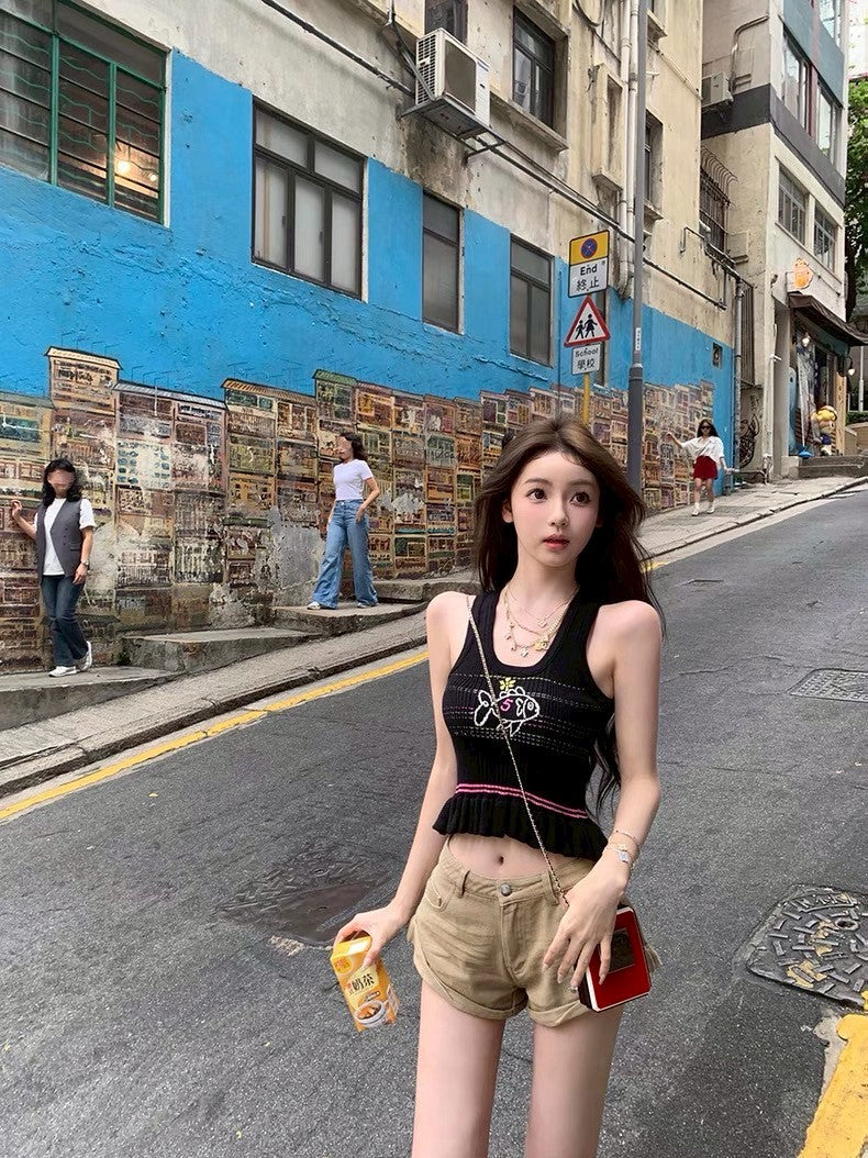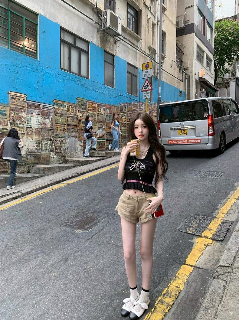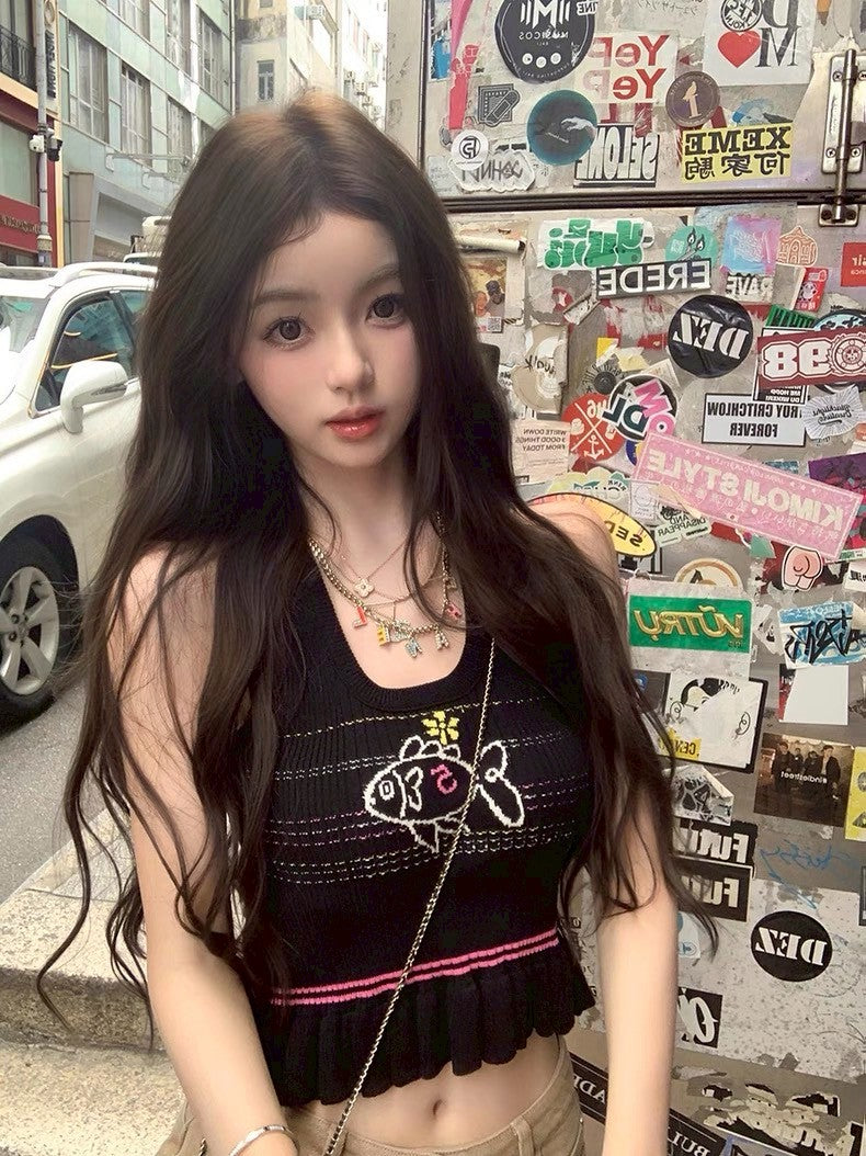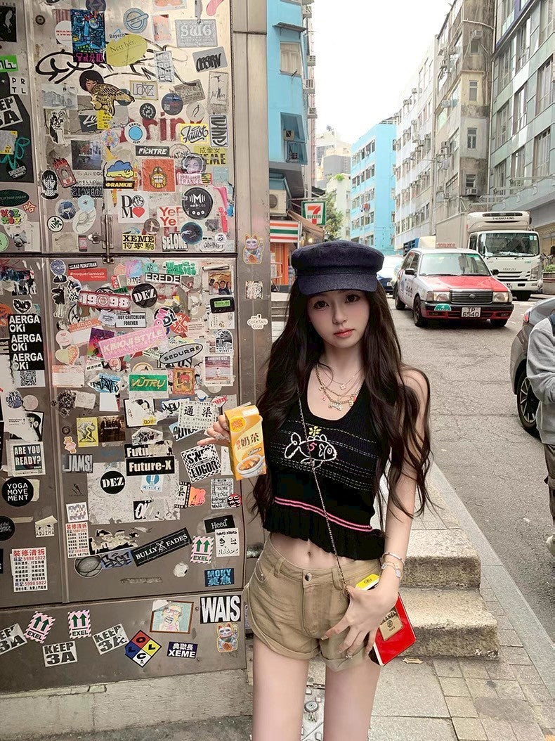 Jun. 童趣魚兒刺繡 收腰花瓣針織背心 黑