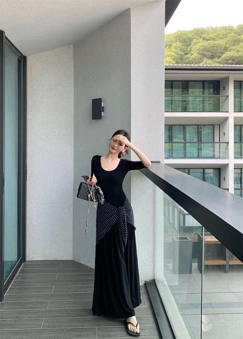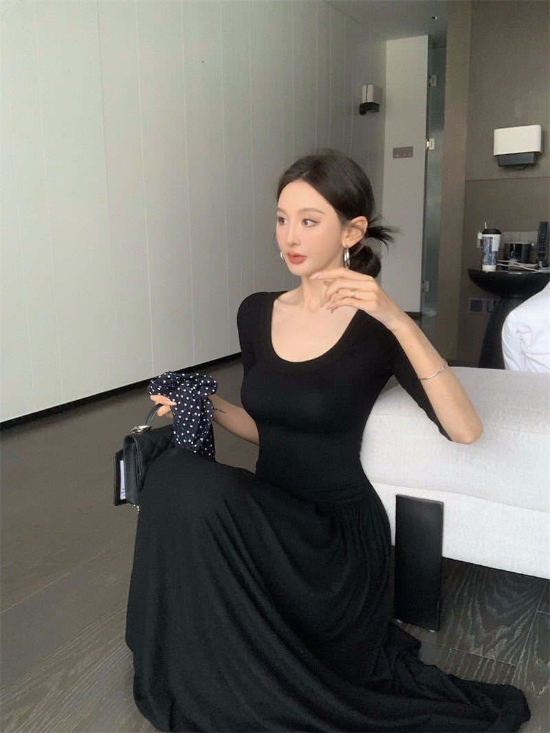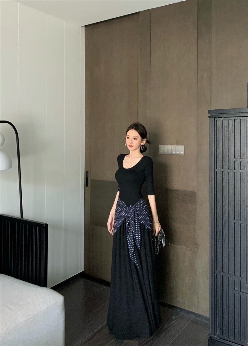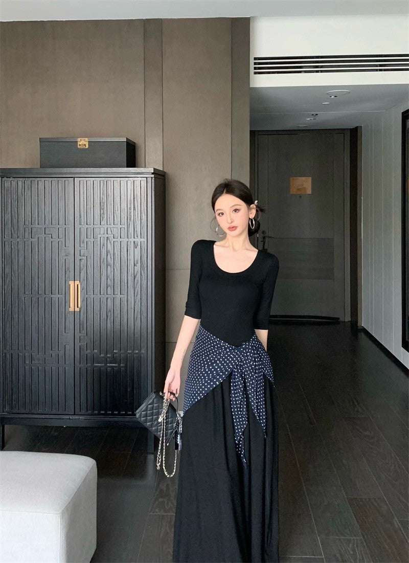Jun. 簡約氣質赫本圓領針織拼接連身裙 黑