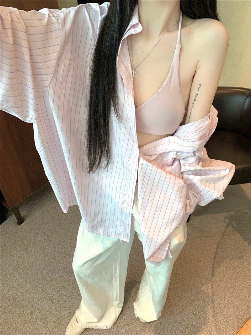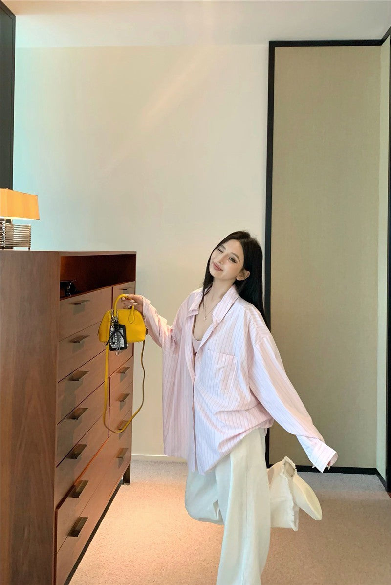 Jun. 粉嫩淡顏 寬鬆通勤條紋襯衫 100萦麻休閒褲