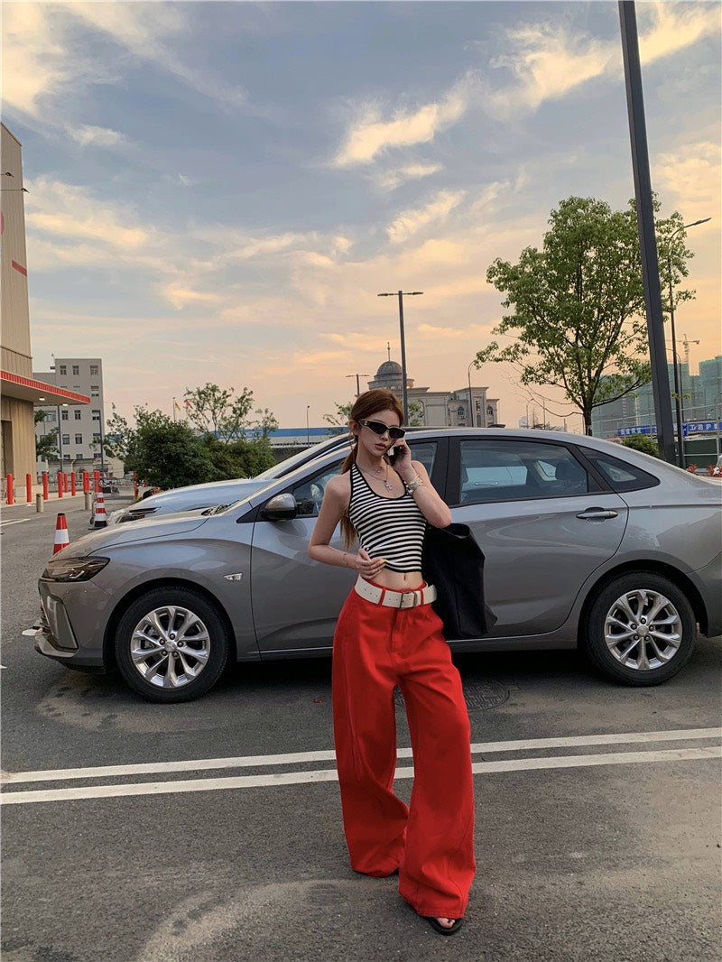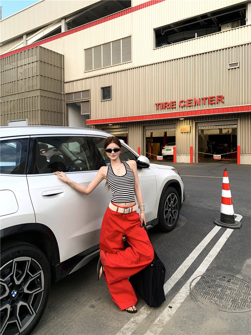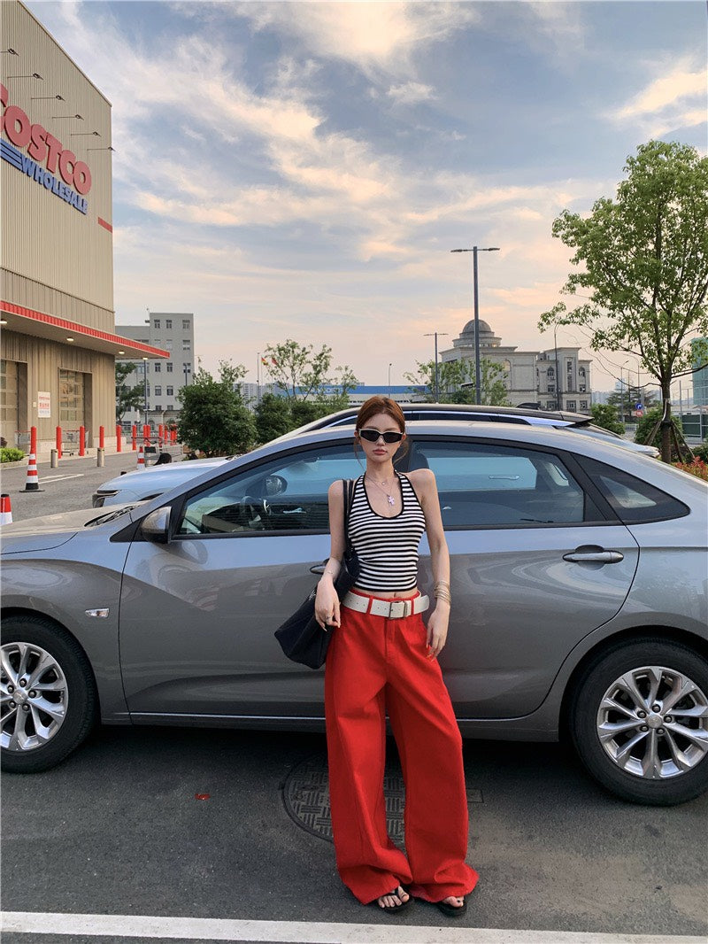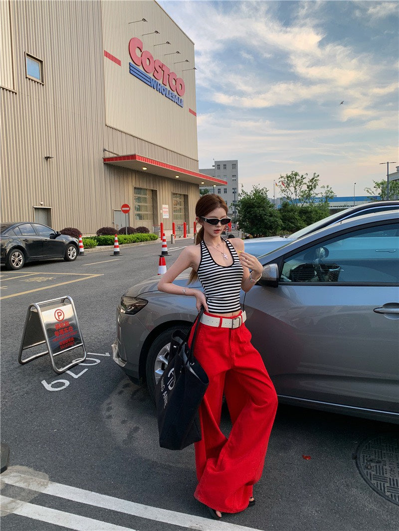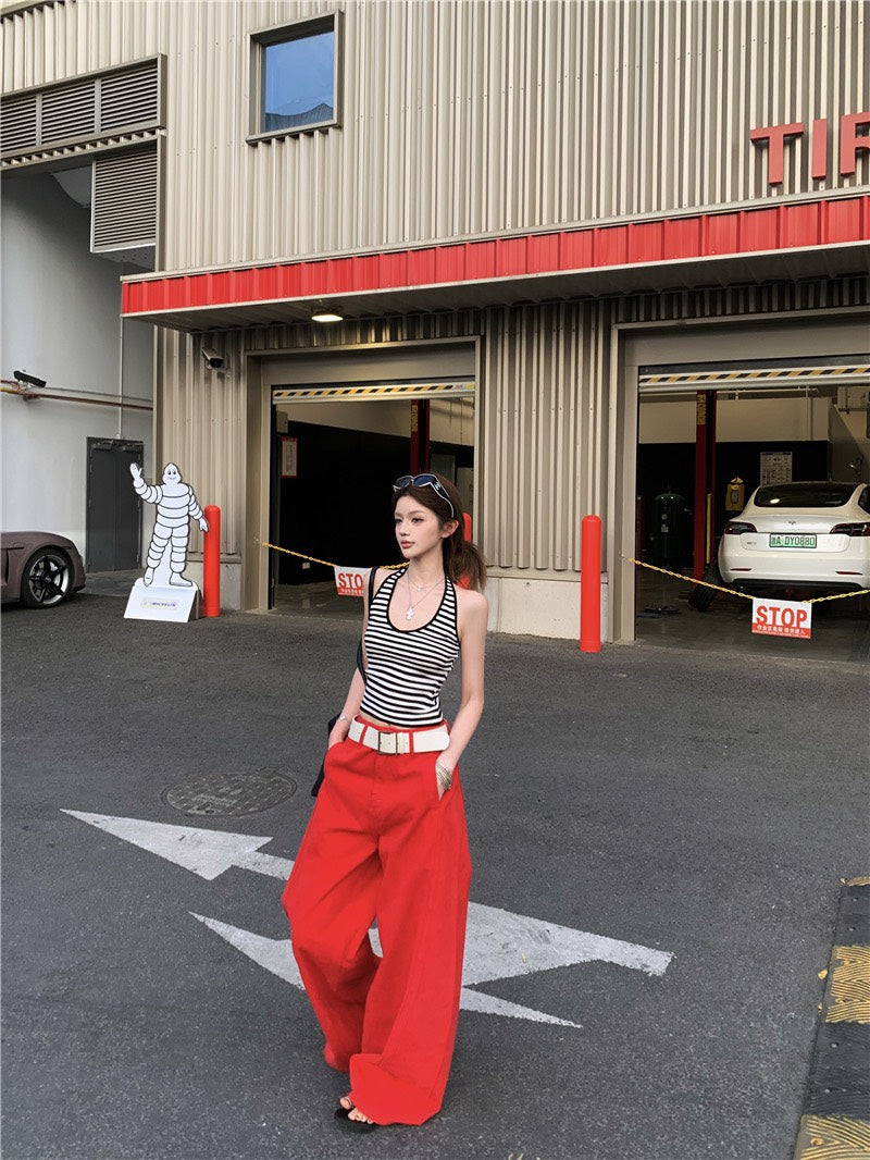 Jun. 經典炸街step高彩度紅色闊腿休閒褲 百搭條紋掛脖背心