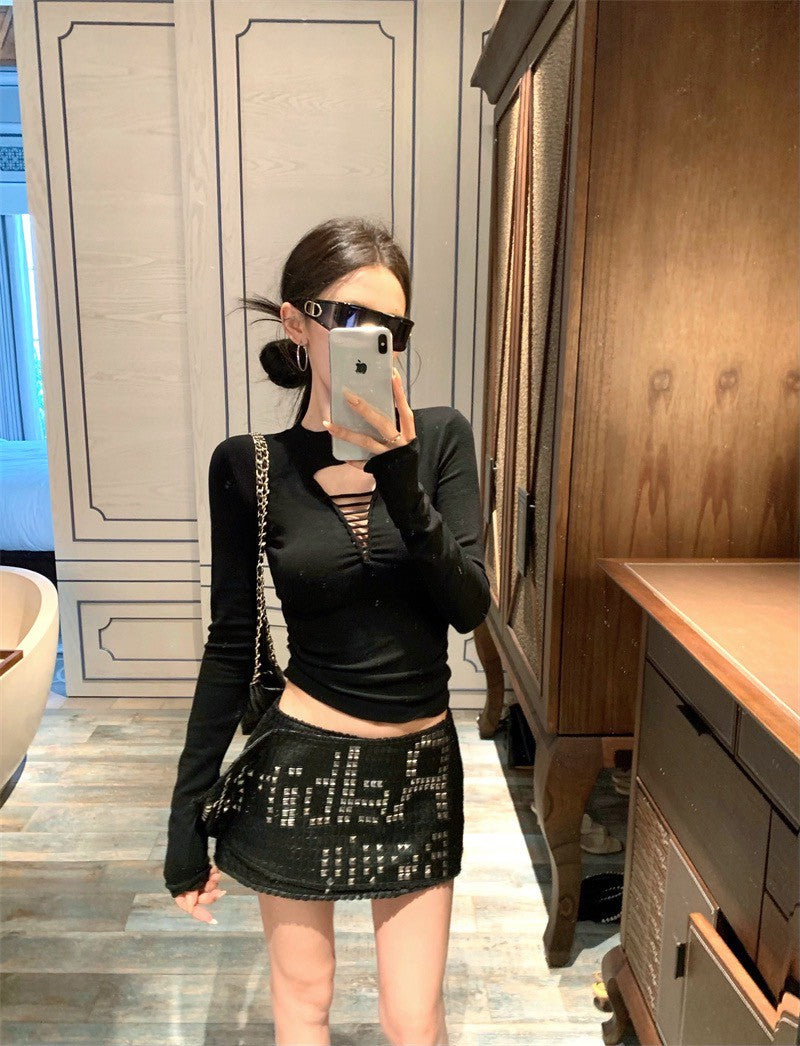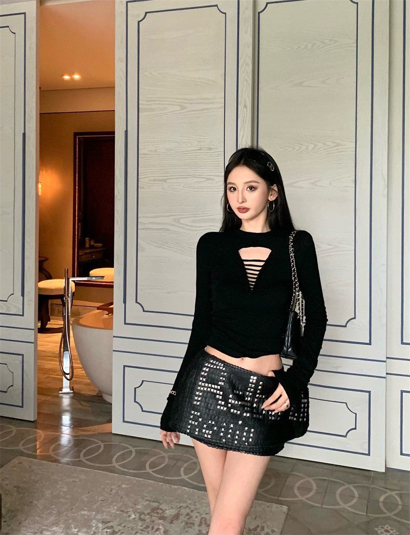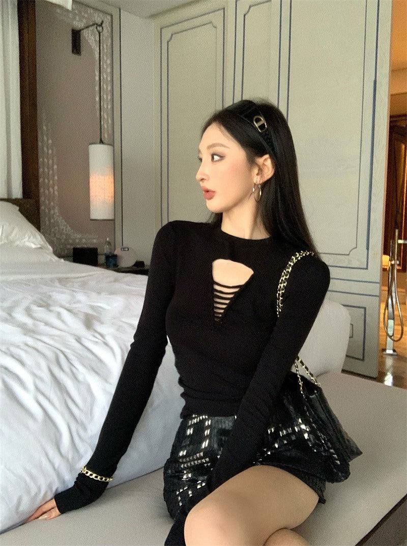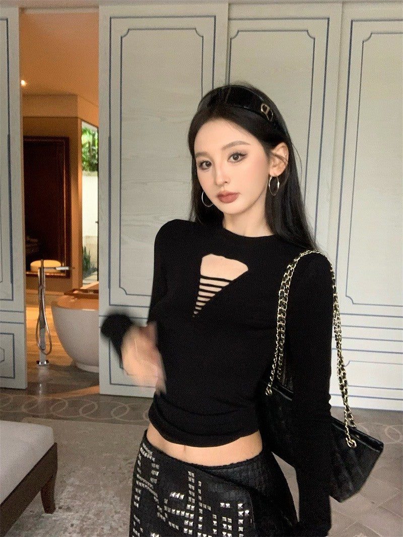 Jun. 辣妹特務 低V縷空設計長袖上衣 黑