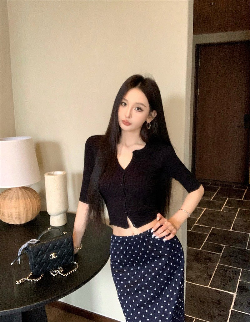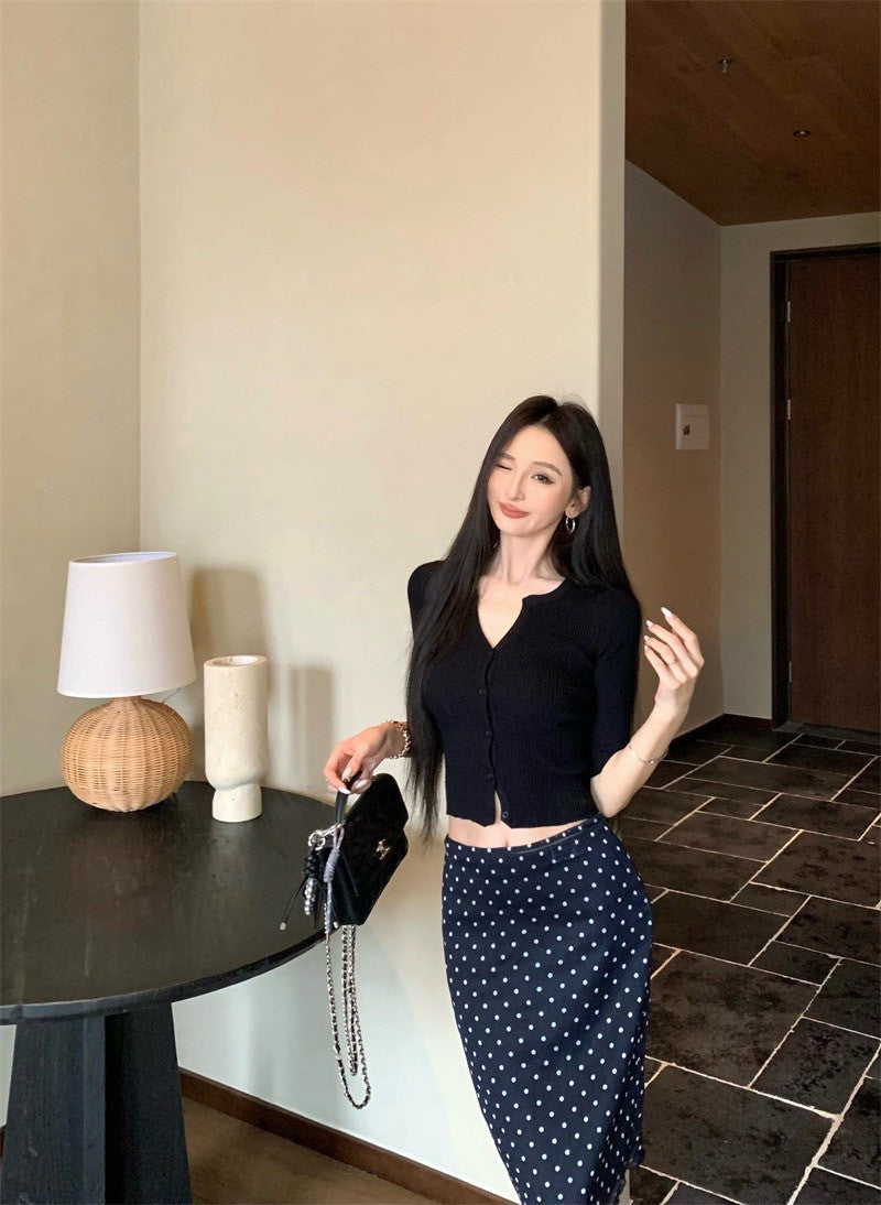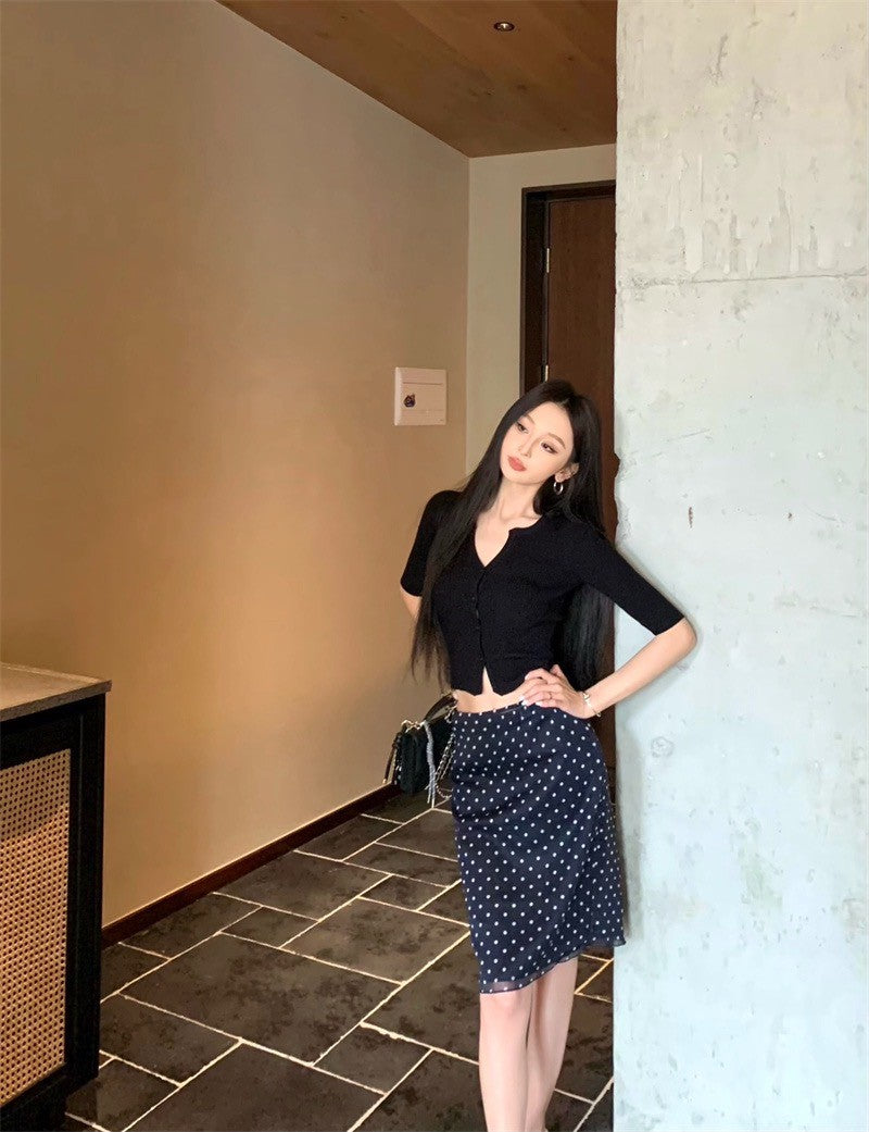 Jun. 鄰家乖乖女 顯瘦鈕扣針織上衣 黑色 復古波點中長半身裙 黑