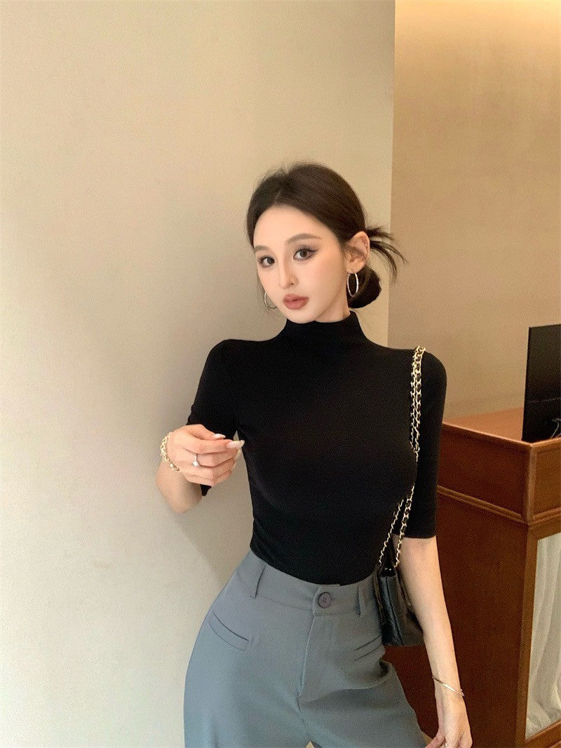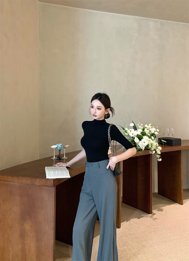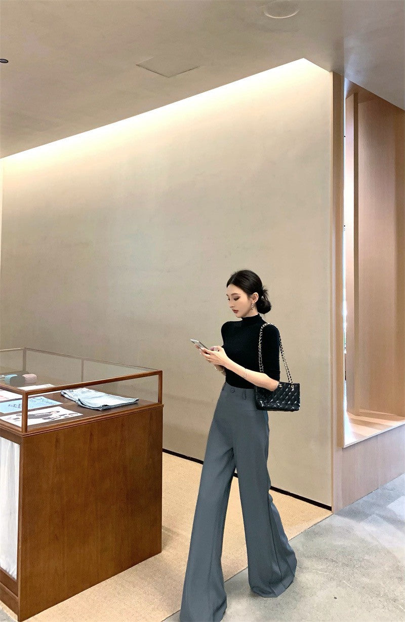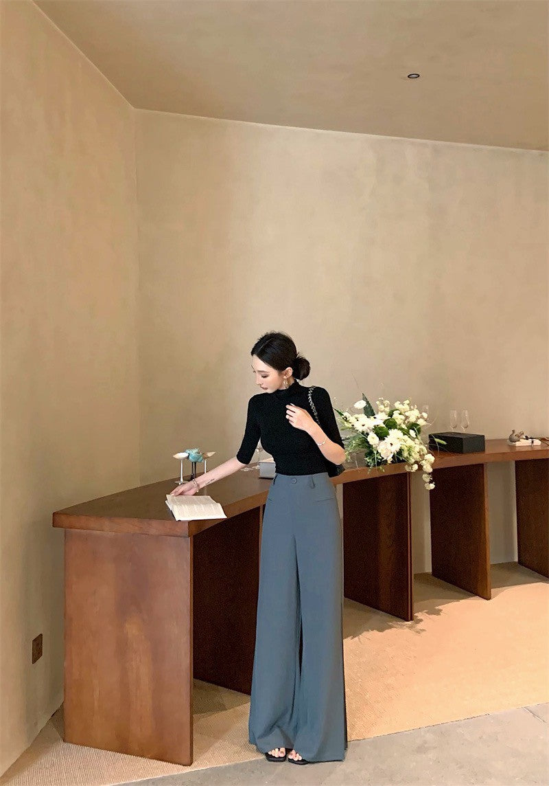 Jun. 高級知性 百搭顯瘦彈力上衣 黑 高腰闊腿褲 灰