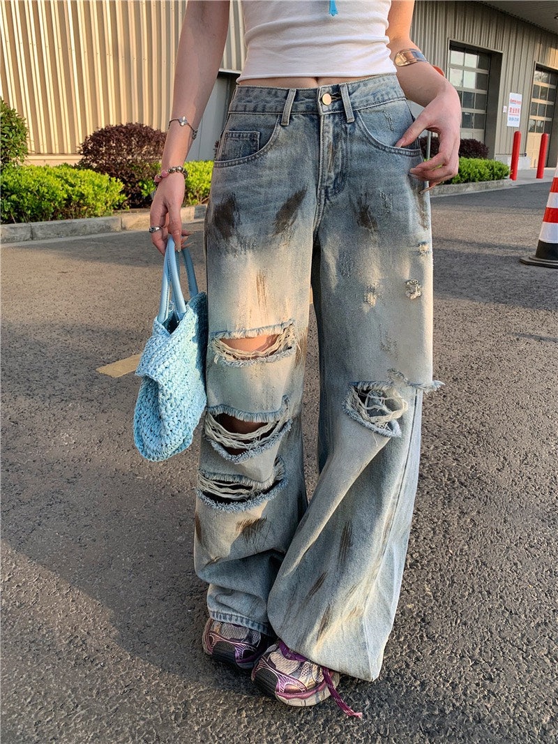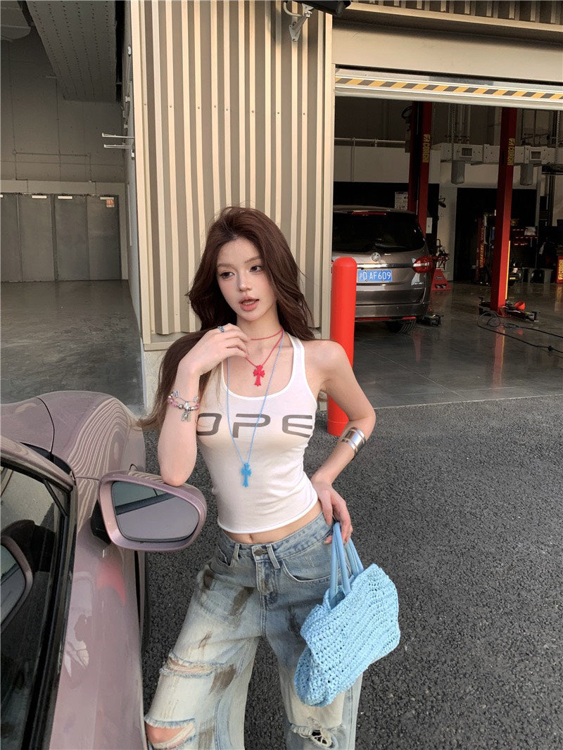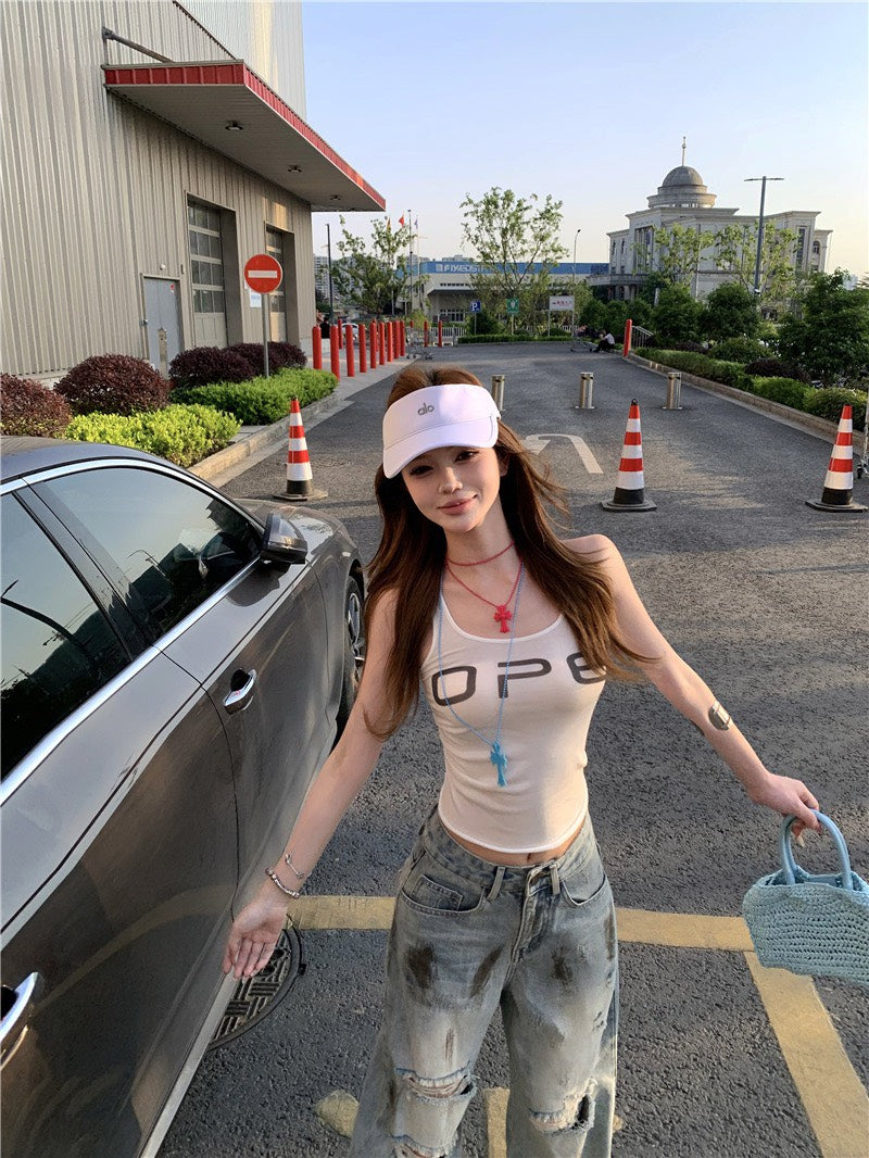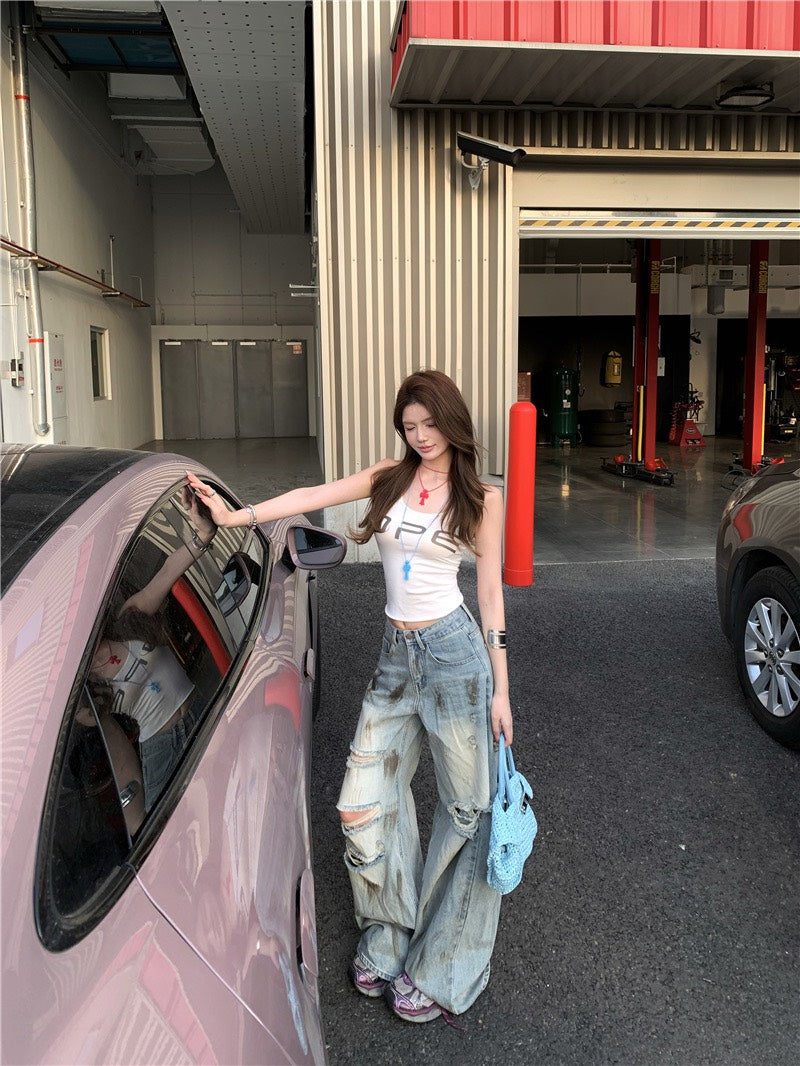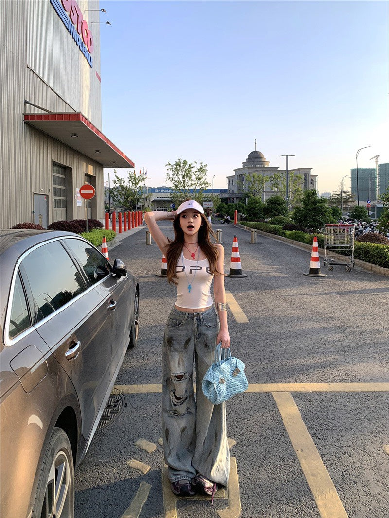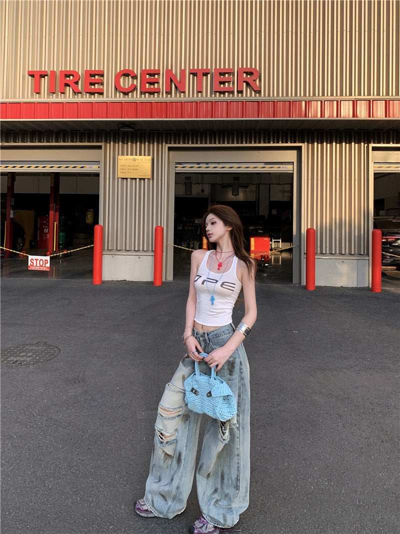 Jun. B家時髦做舊刷破髒髒褲 簡約字母打底白色背心