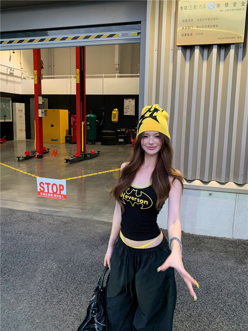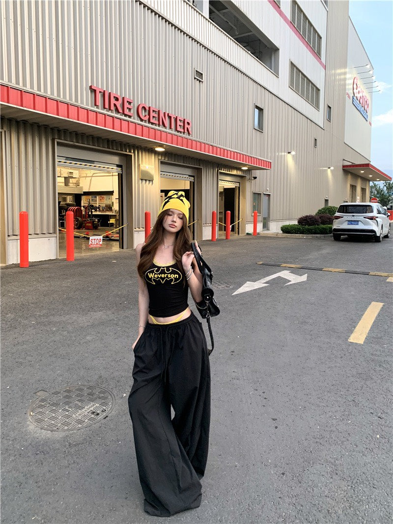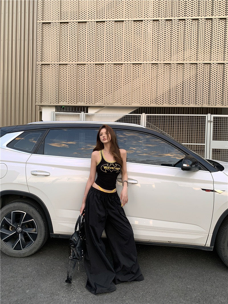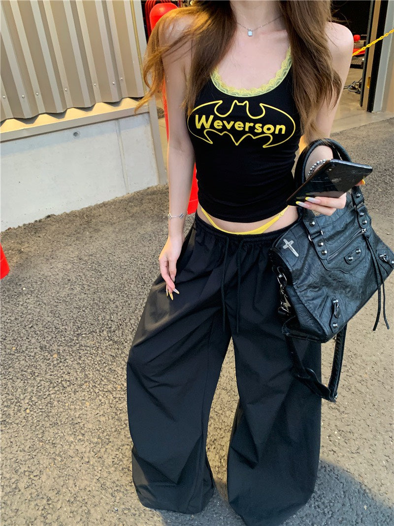 Jun. LA個性女孩 撞色蝙蝠字母印花背心 抽繩鬆緊黑色休閒褲