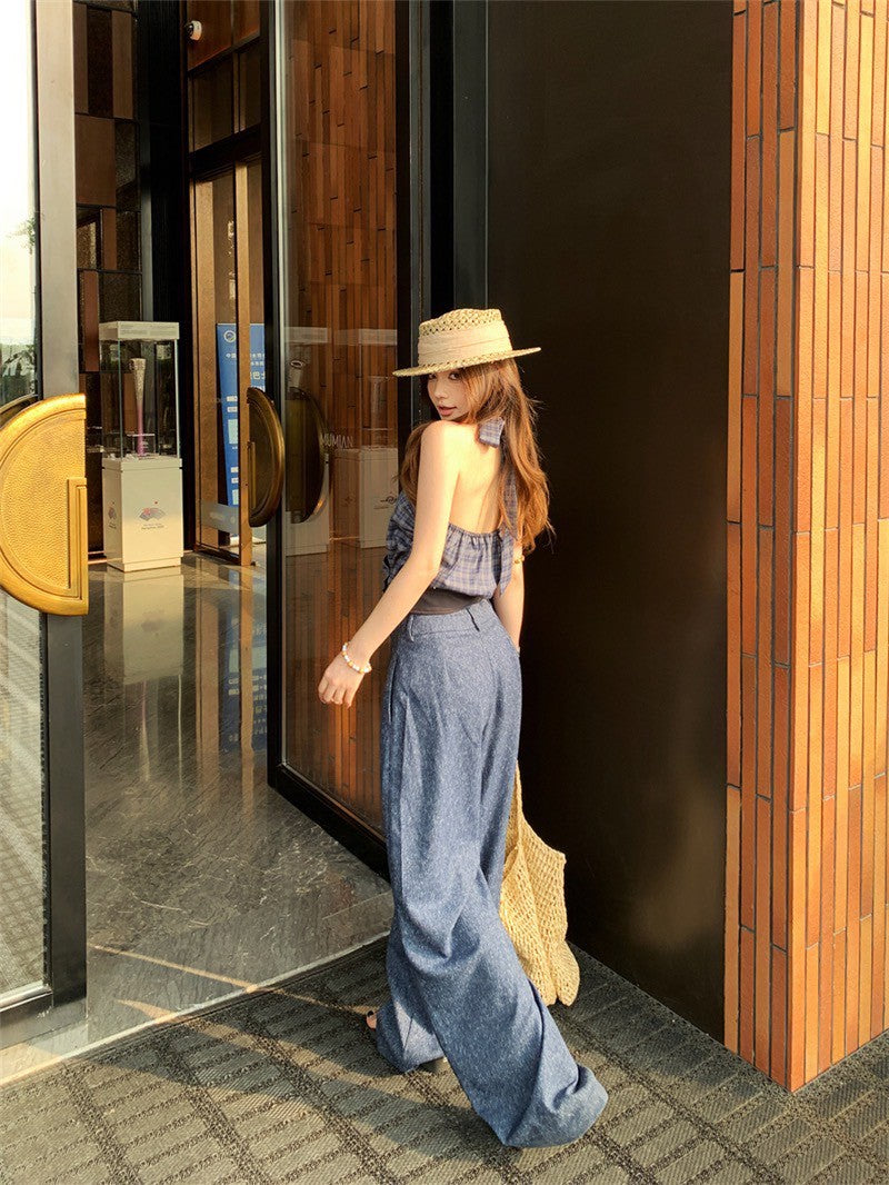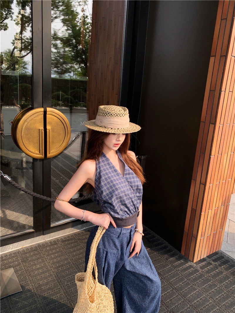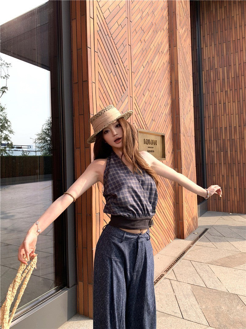 Jun. Spicy辣妹私服 復古格紋掛脖上衣 高腰休閒褲