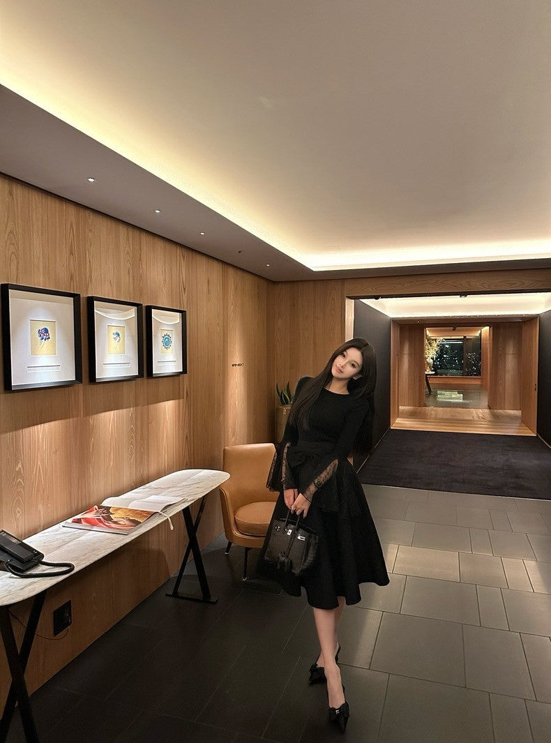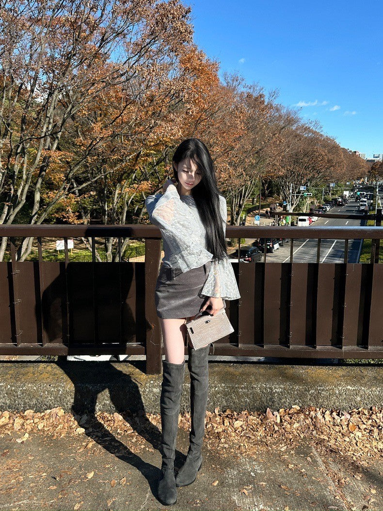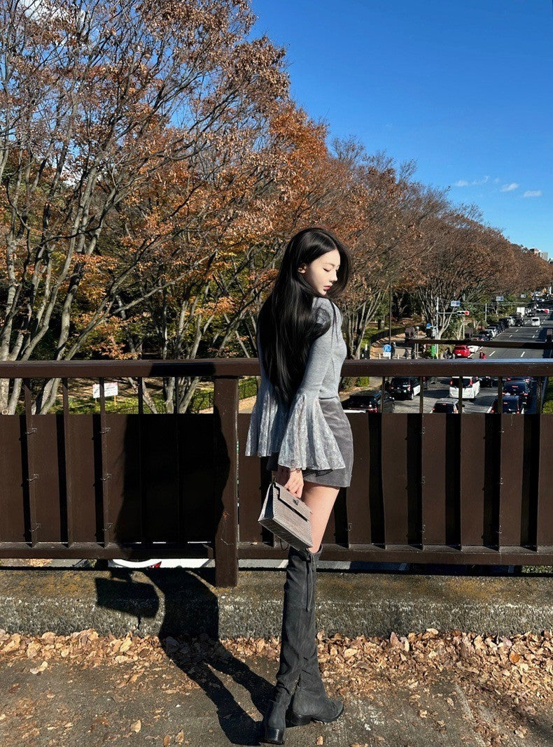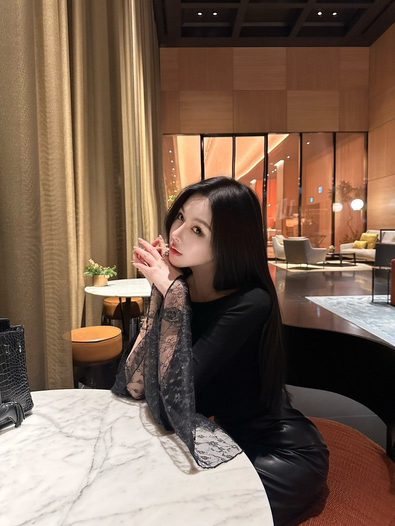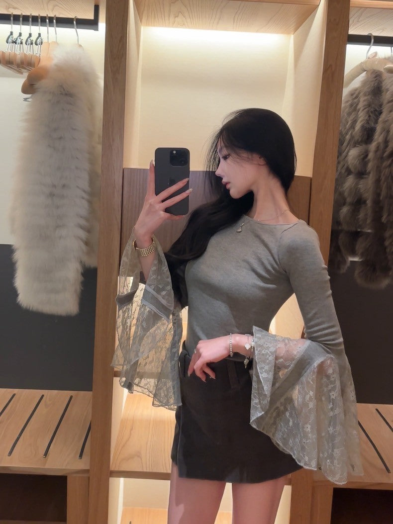 Mar. 天鵝挽夢 氣質法式蕾絲喇叭袖修身上衣 黑/灰