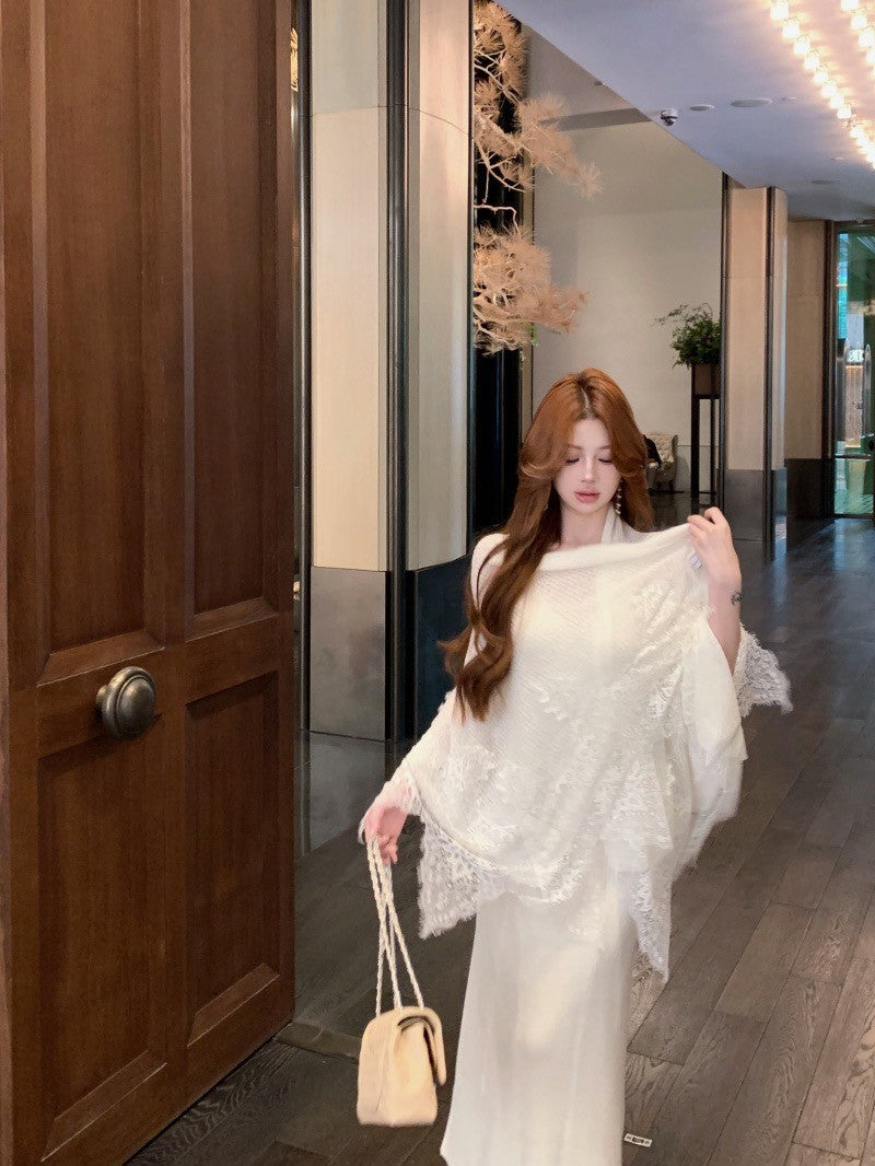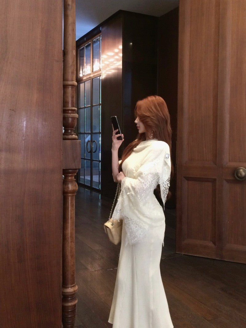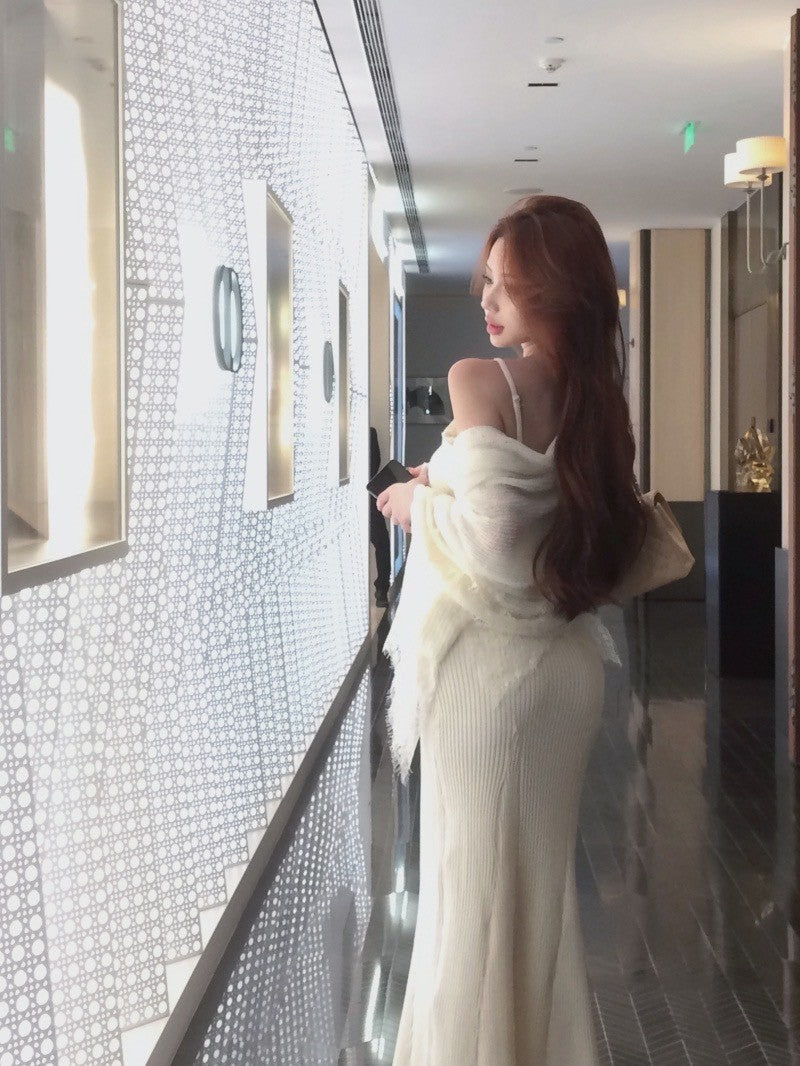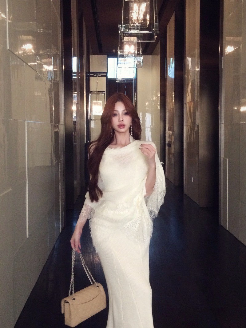 Mar. 氣質柔光 蕾絲海馬絨針織披肩 V領修身連身裙 杏