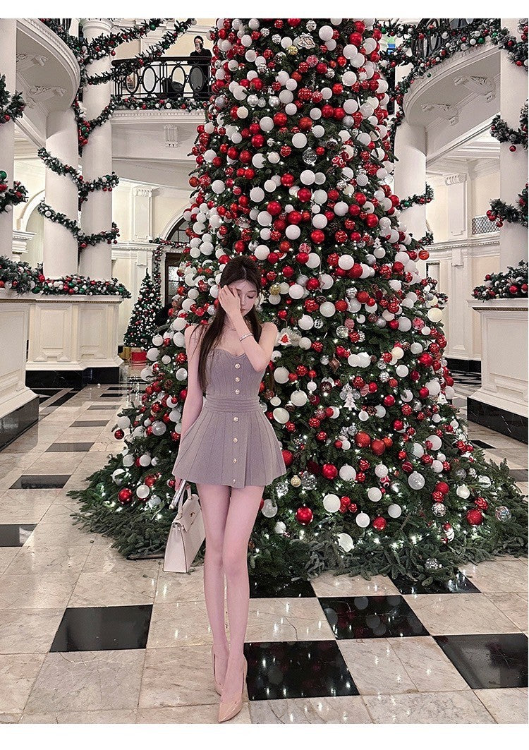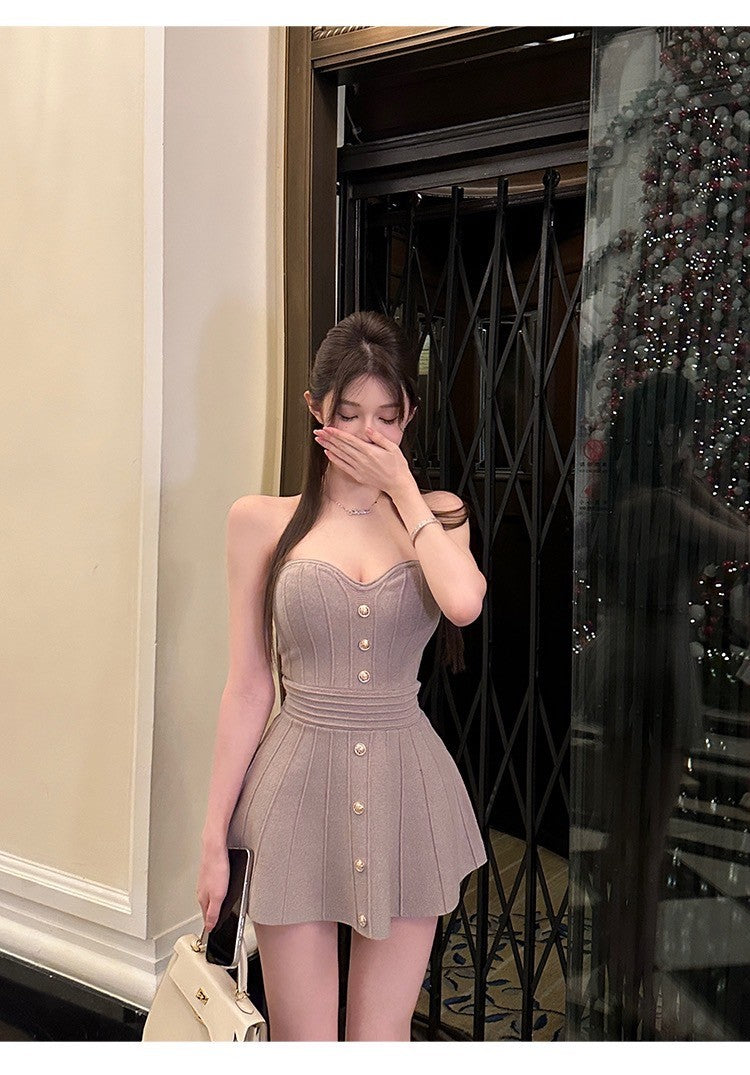 Mar. 溫雅千金 奶藕灰氣質抹胸收腰花瓣連身裙