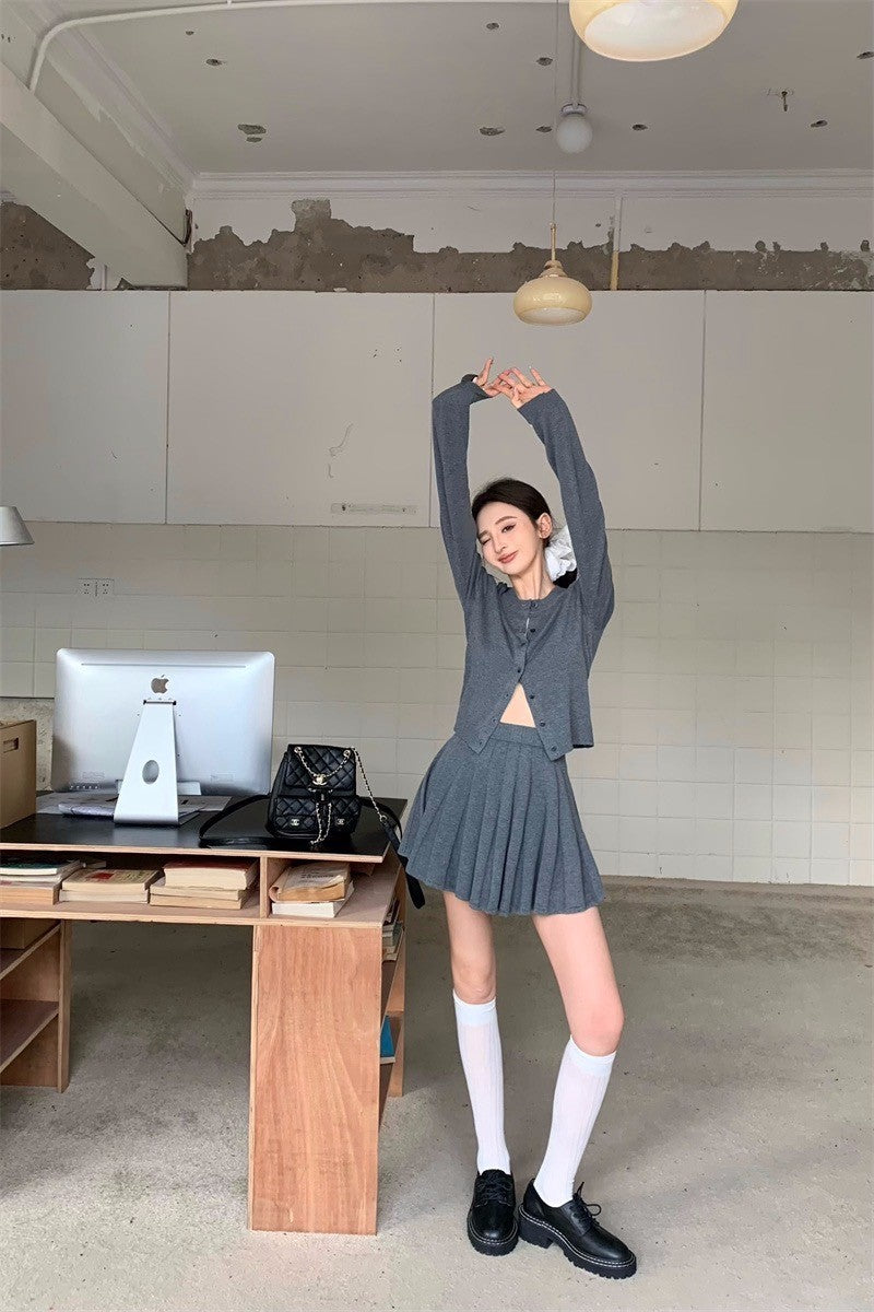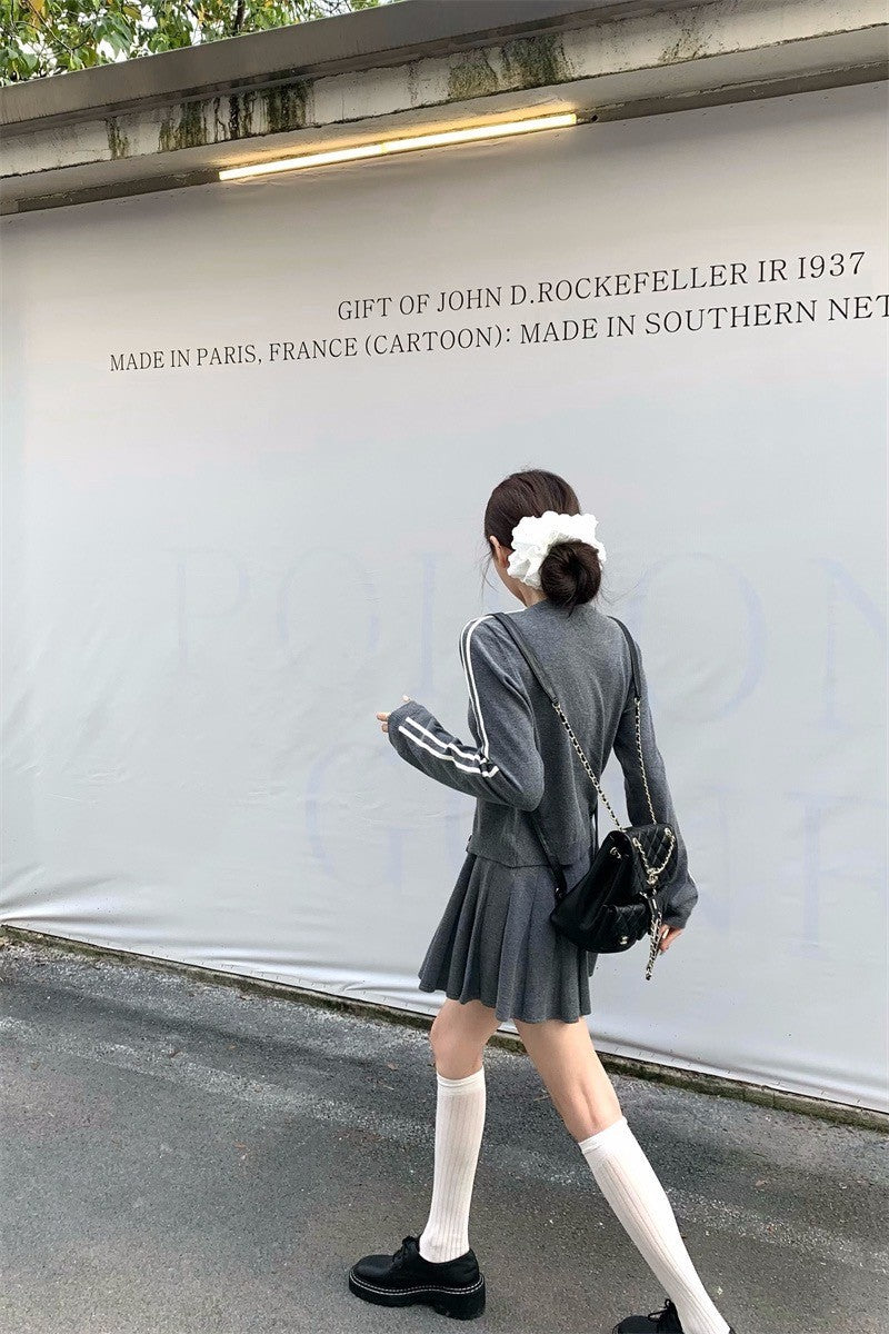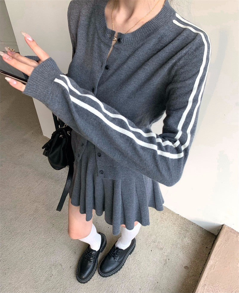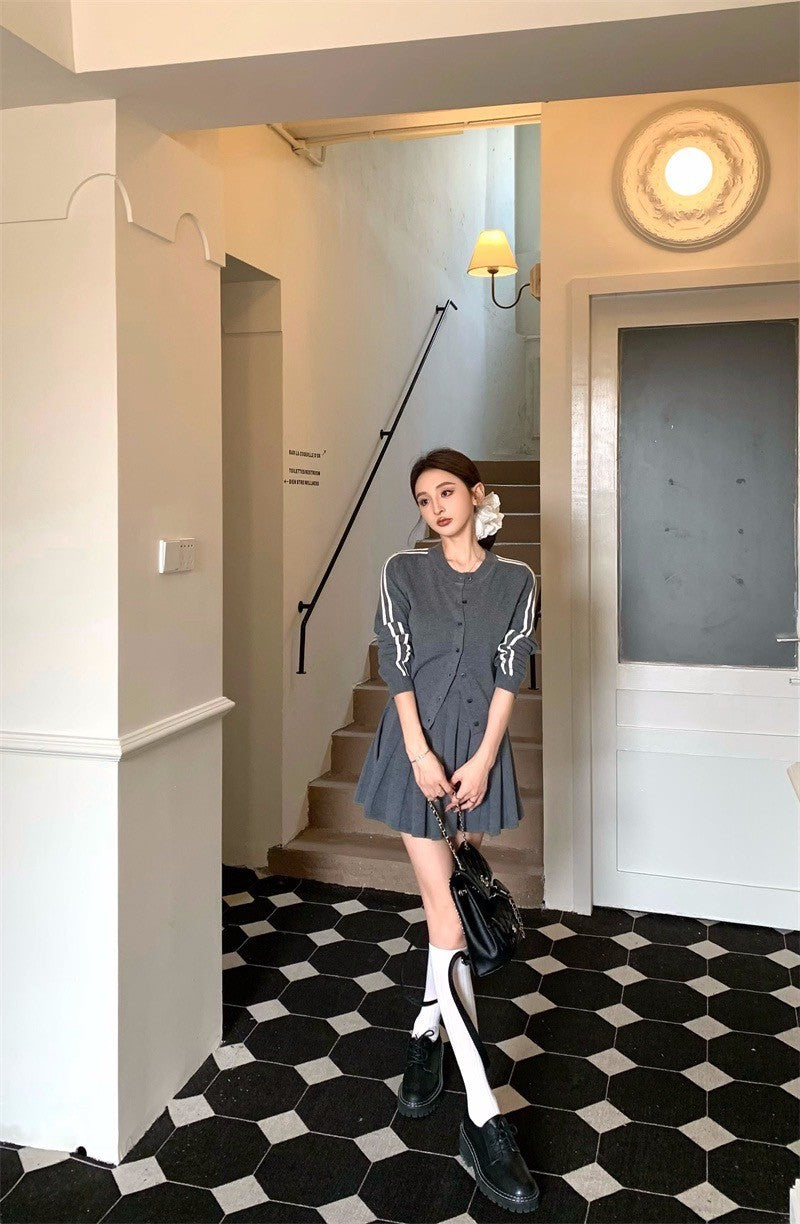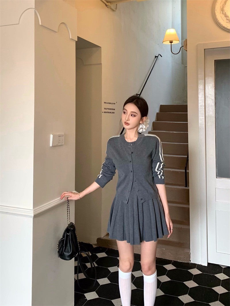 Mar. 韓系學院 雙槓圓領針織開衫 百褶半身裙 灰