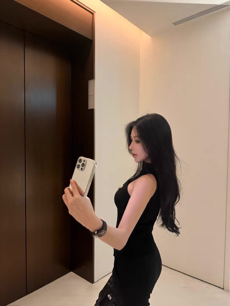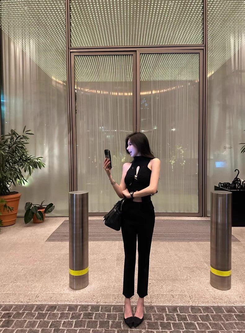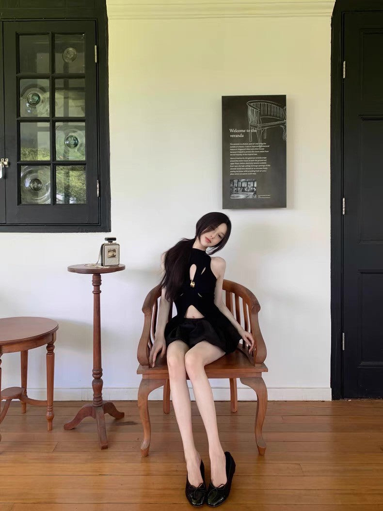 May. 千金即視感 貴氣高奢小巴扭結縷空針織背心 黑