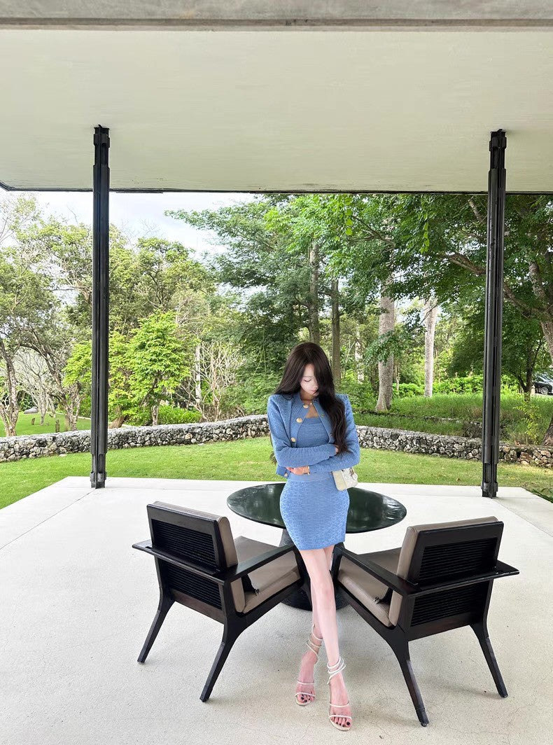May. 小巴經典版型 立體壓印脖扣式針織背心 半身裙套裝 藍