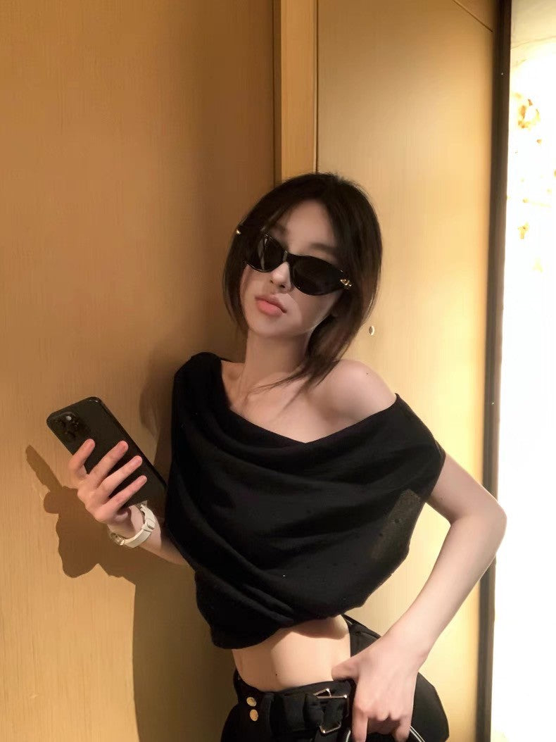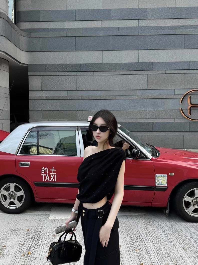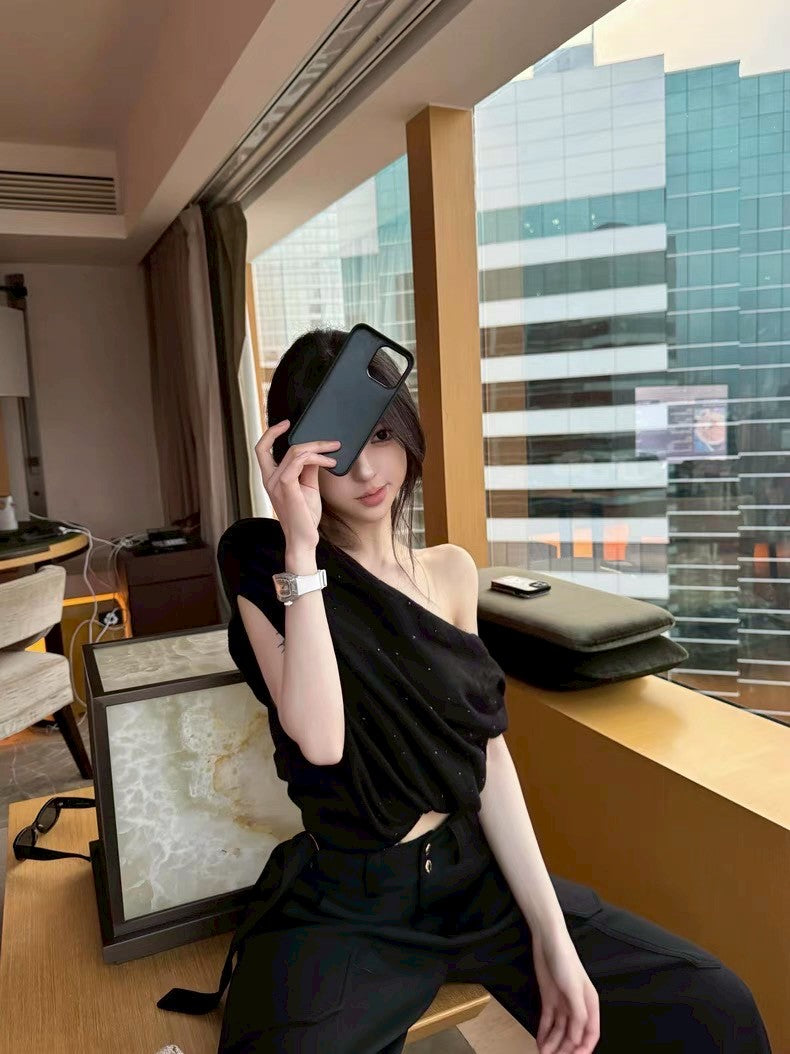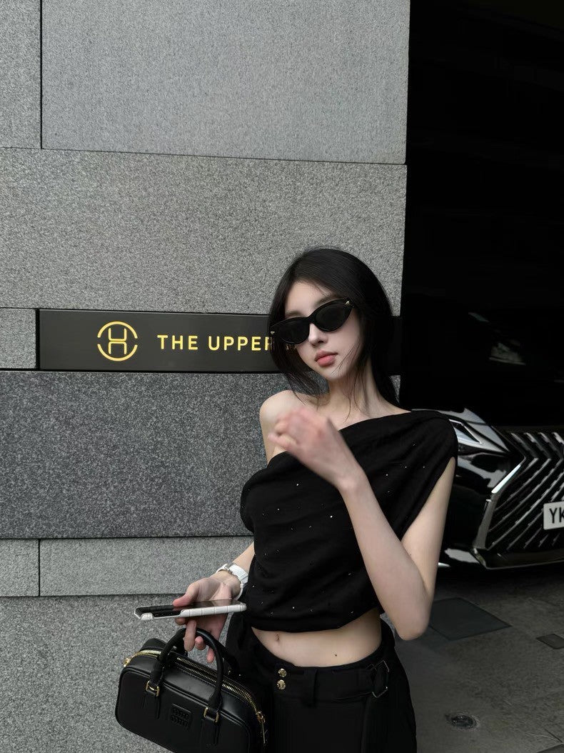 May. 曖昧氛圍 鬆弛感燙鑽一字肩針織上衣 黑