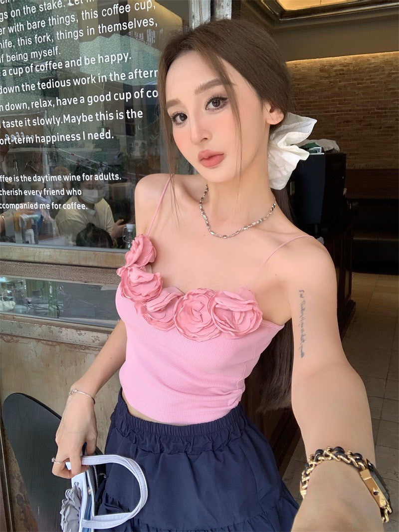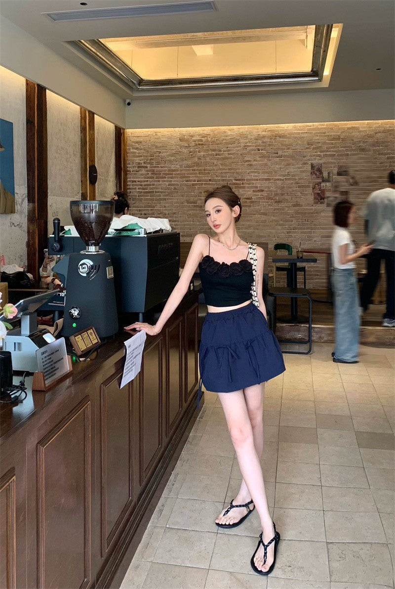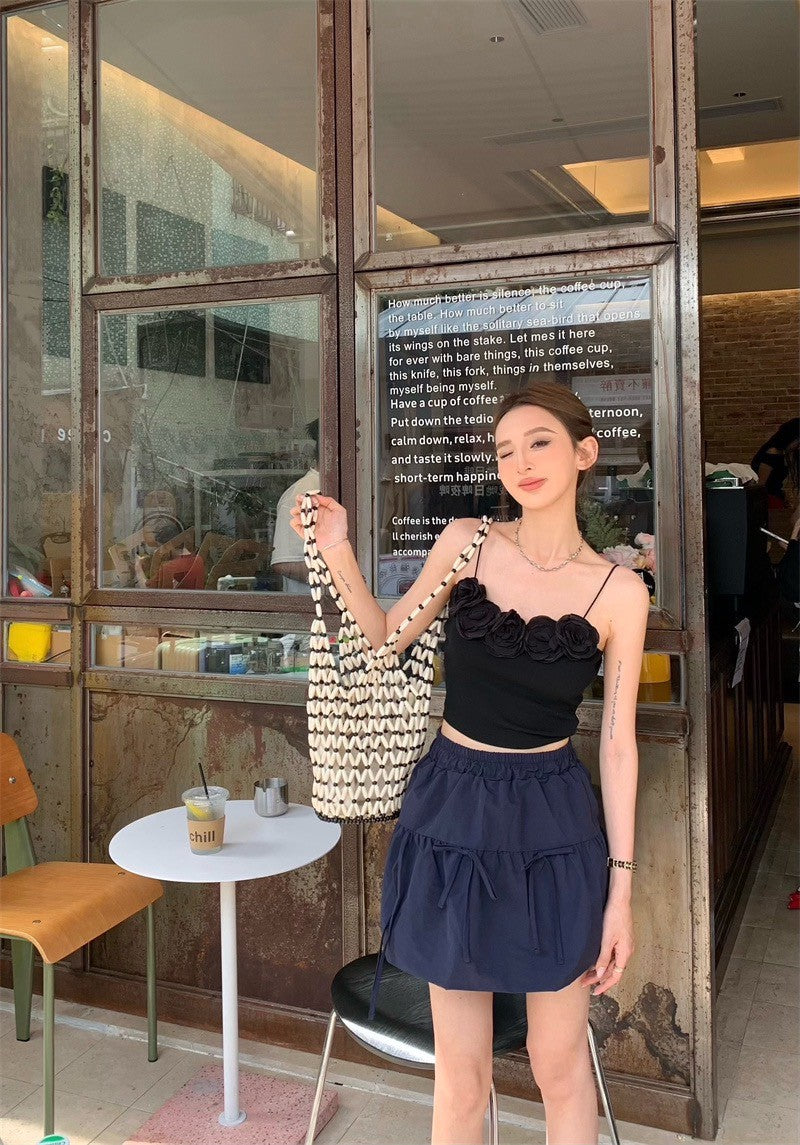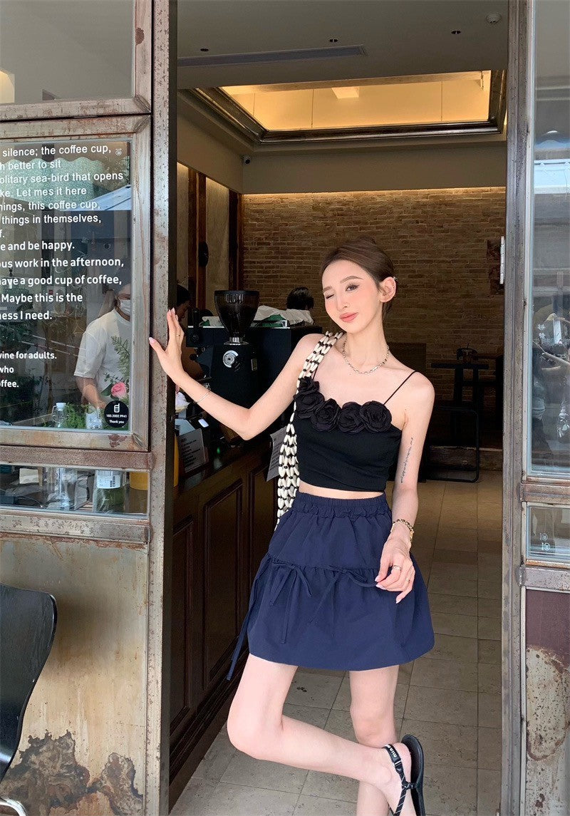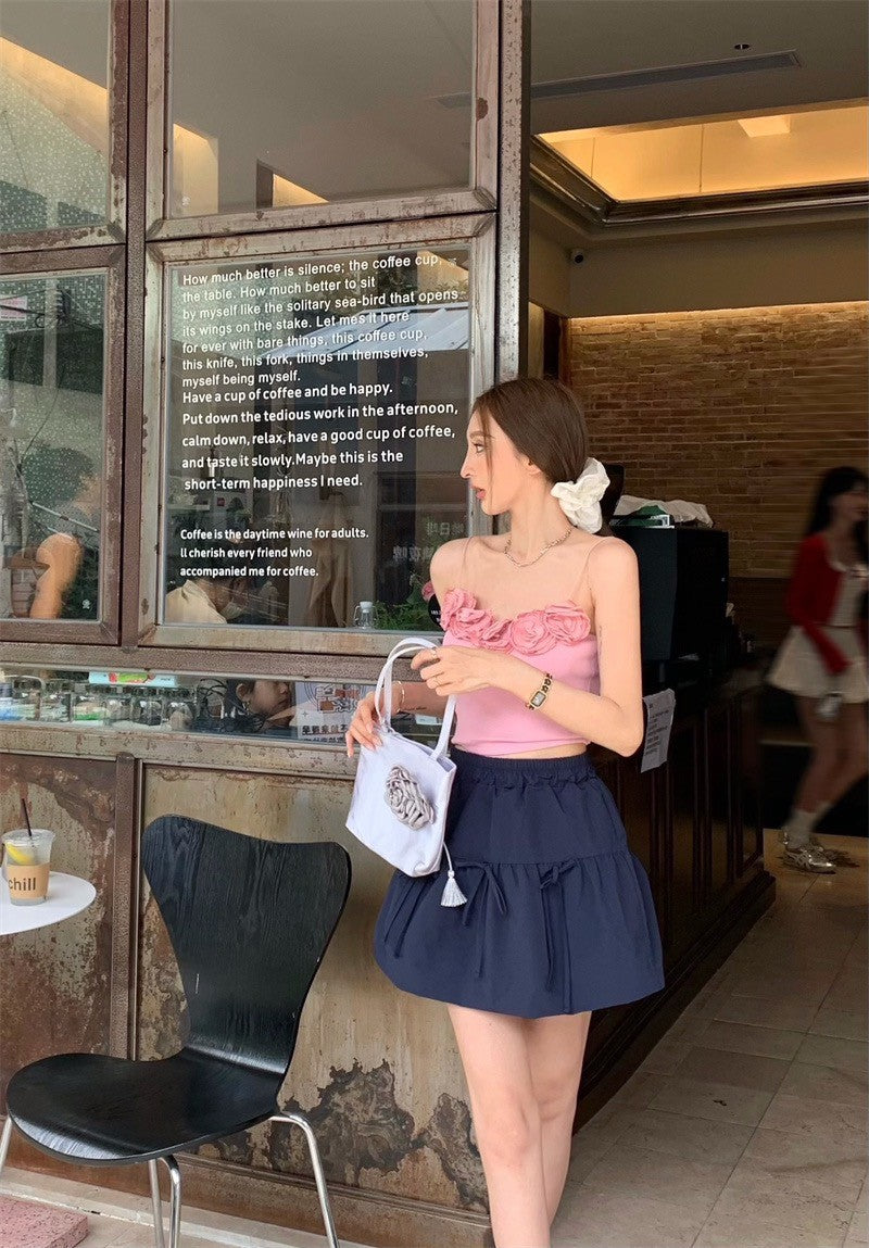 May. 梨花洋溢 俏皮立體花朵背心 粉/黑 顯瘦藍色A字裙