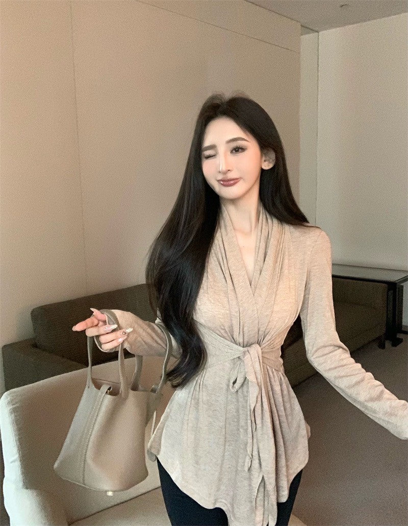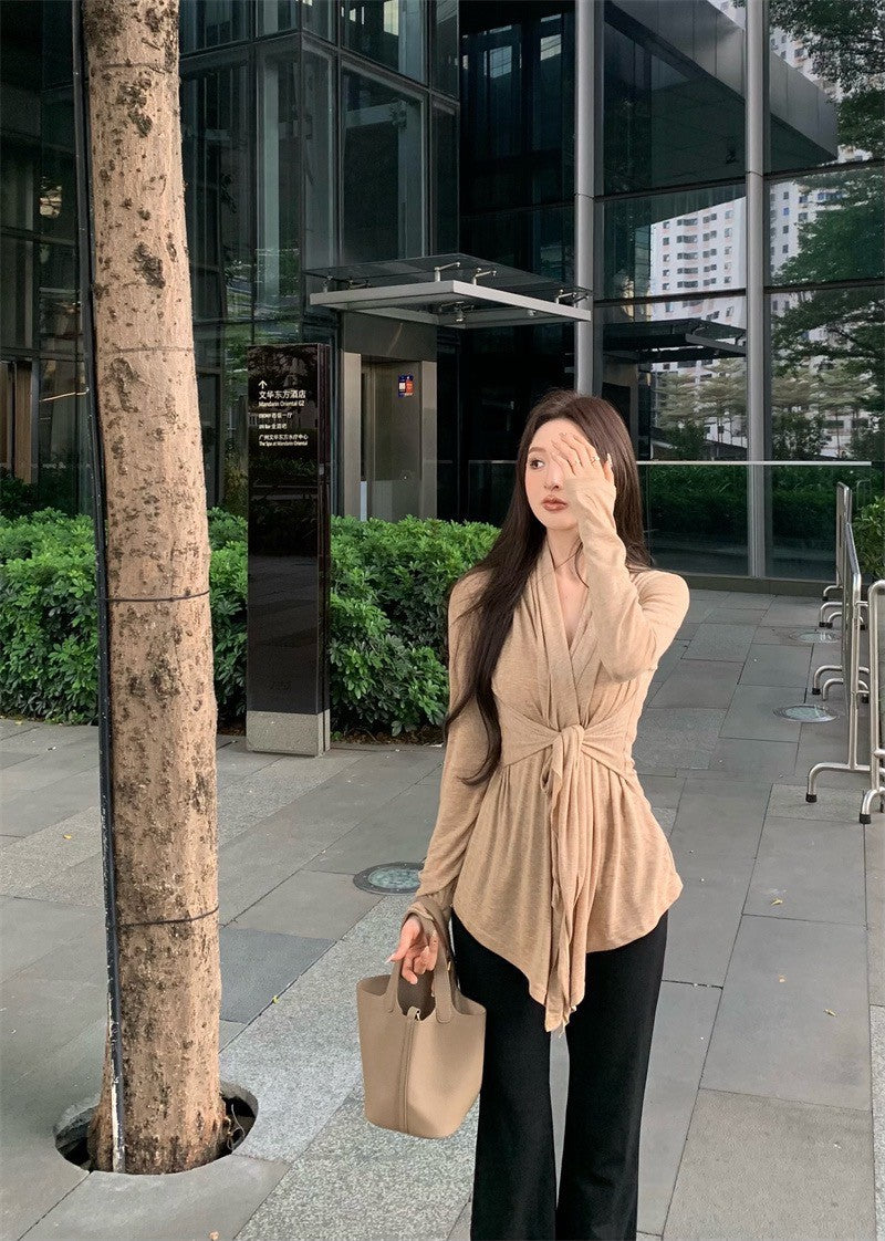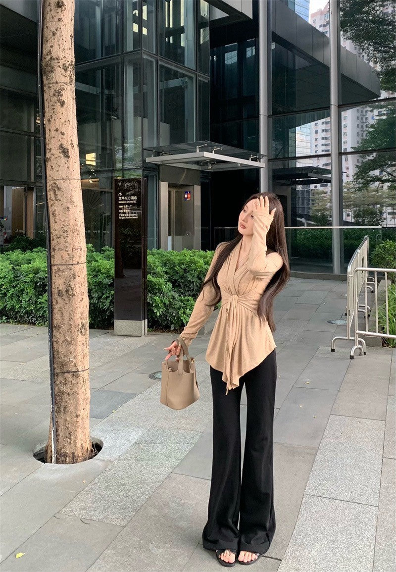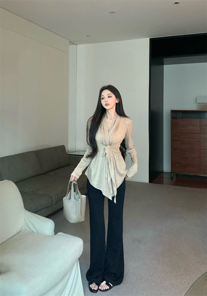 May. 氣質疊領綁帶長袖開衫 杏 高腰微喇叭黑色休閒褲