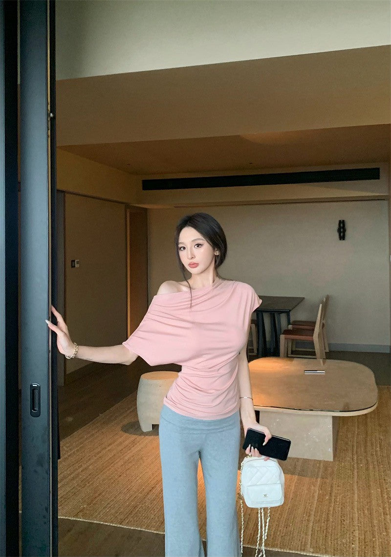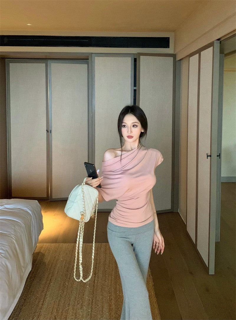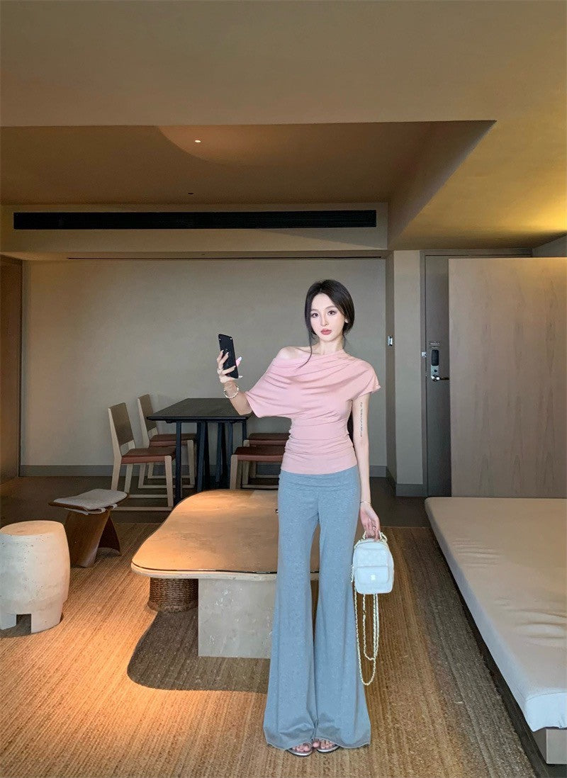 May. 輕氧週末 不規則斜肩蘯領上衣 粉 灰色休閒長褲