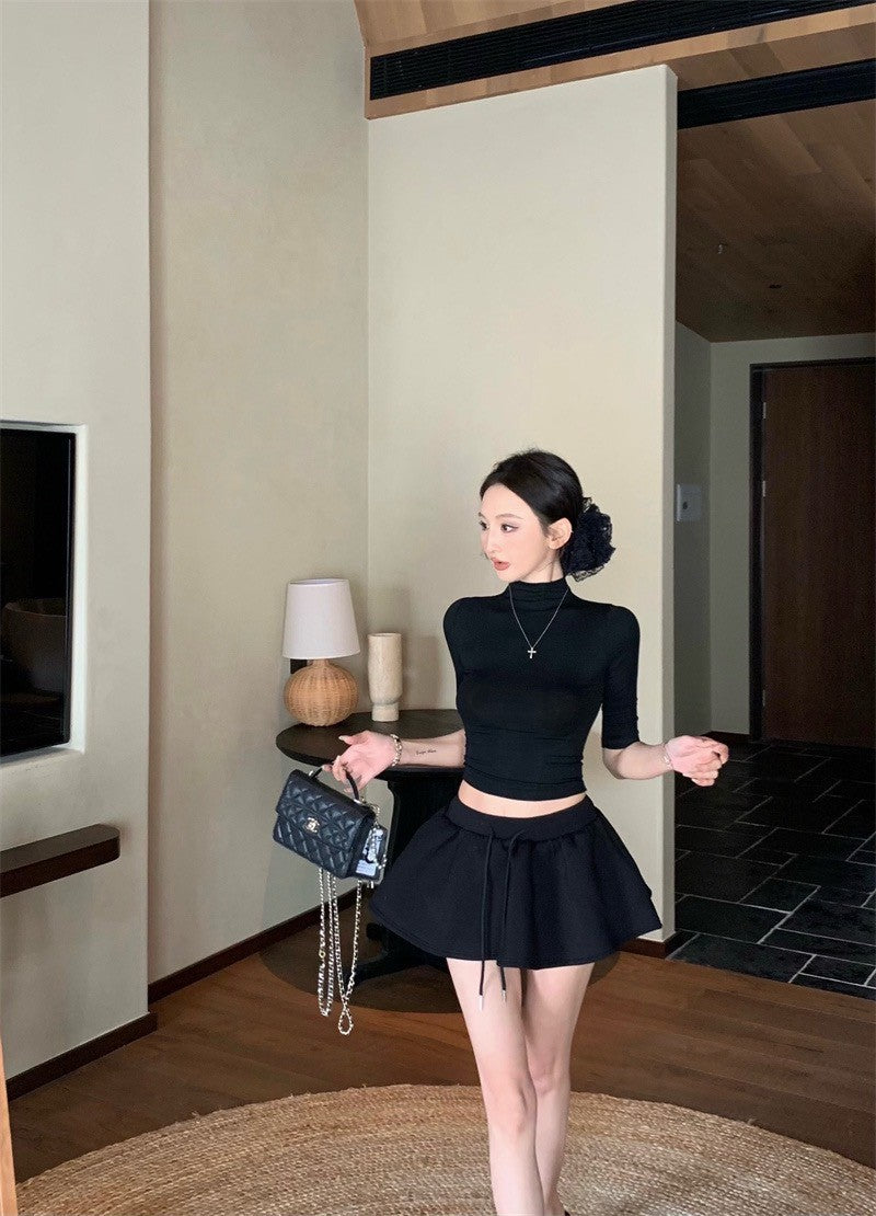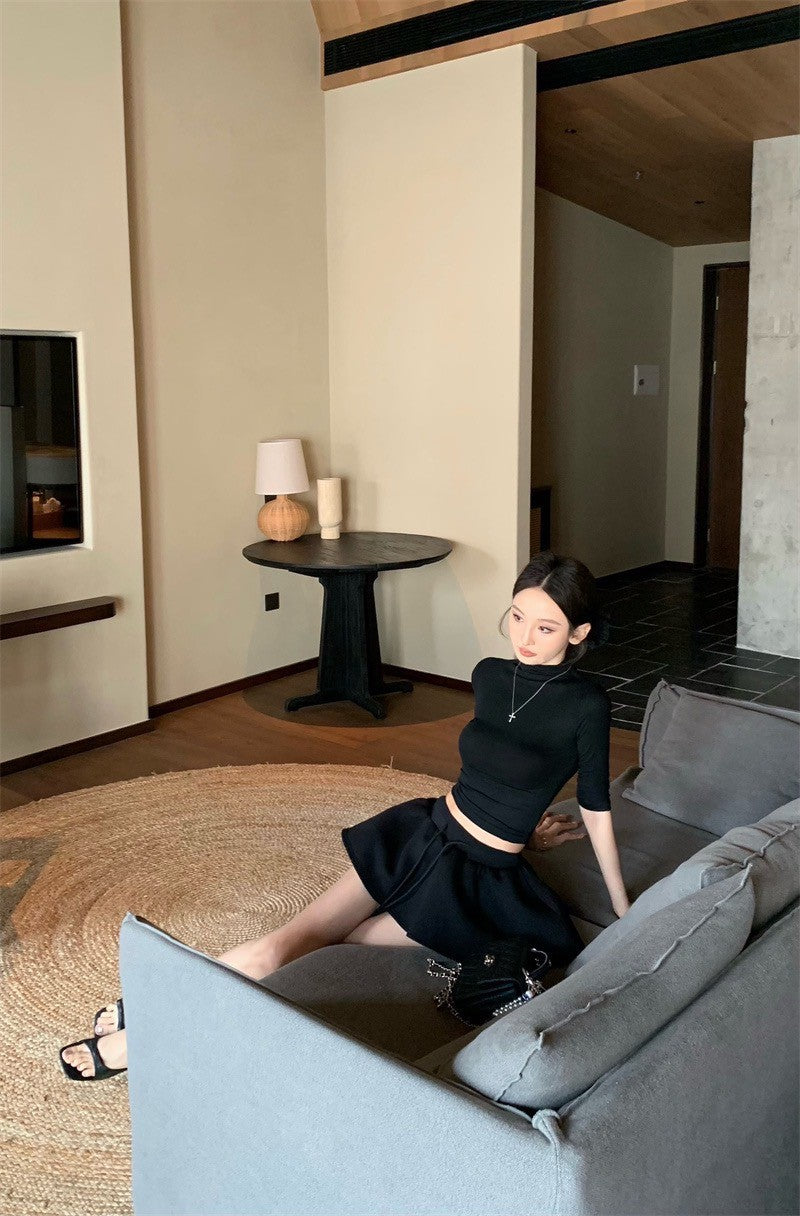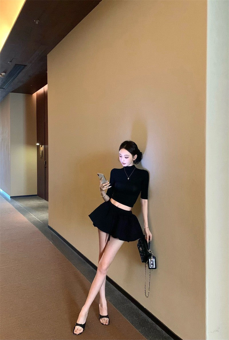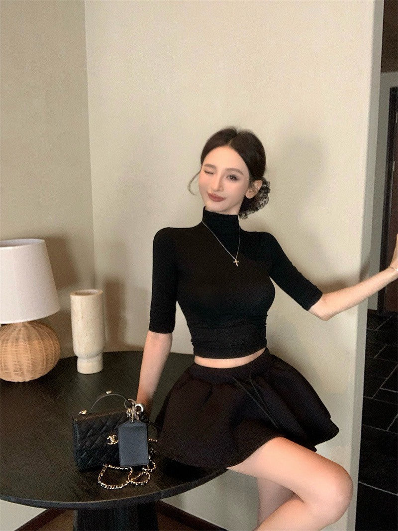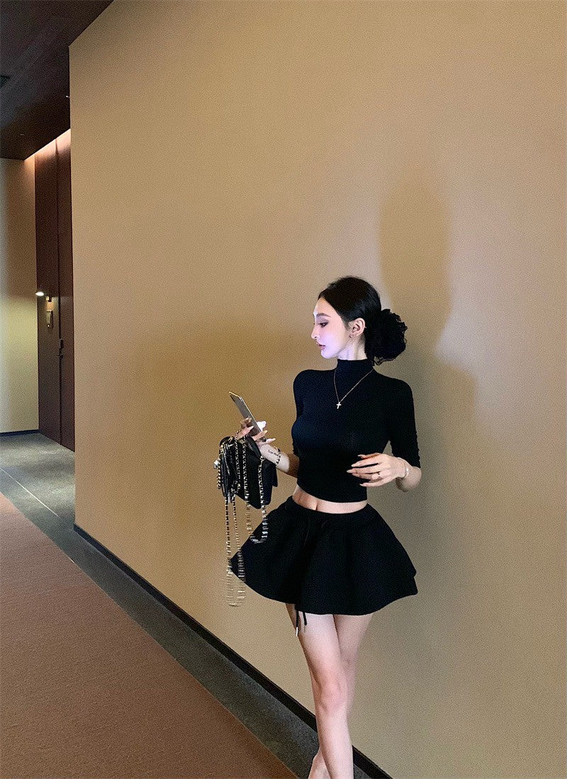 May. 韓團甜心 高領五分袖修身黑色上衣 高腰花瓣黑色澎澎裙