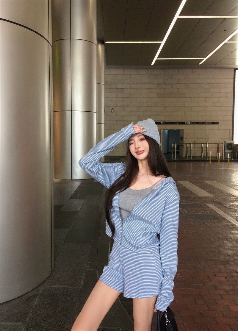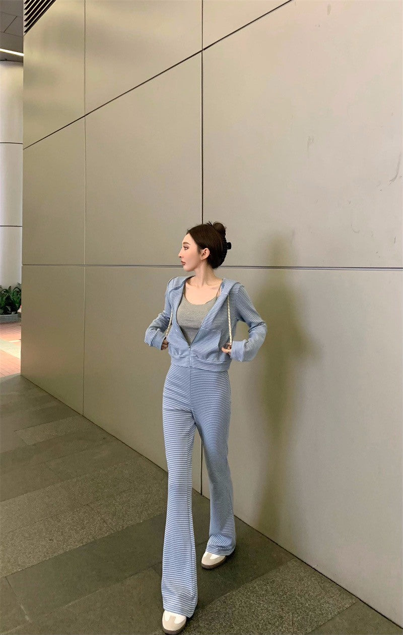 May. 韓女休閒 通勤橫條紋連帽外套 長短款休閒褲 藍