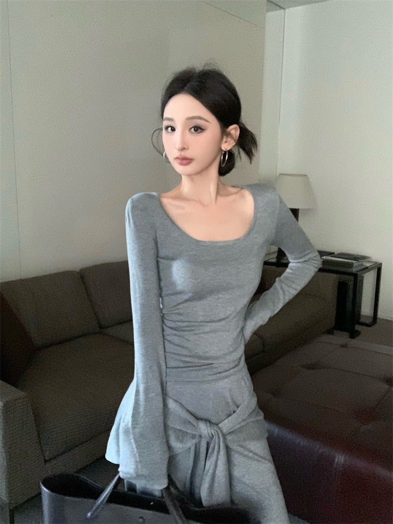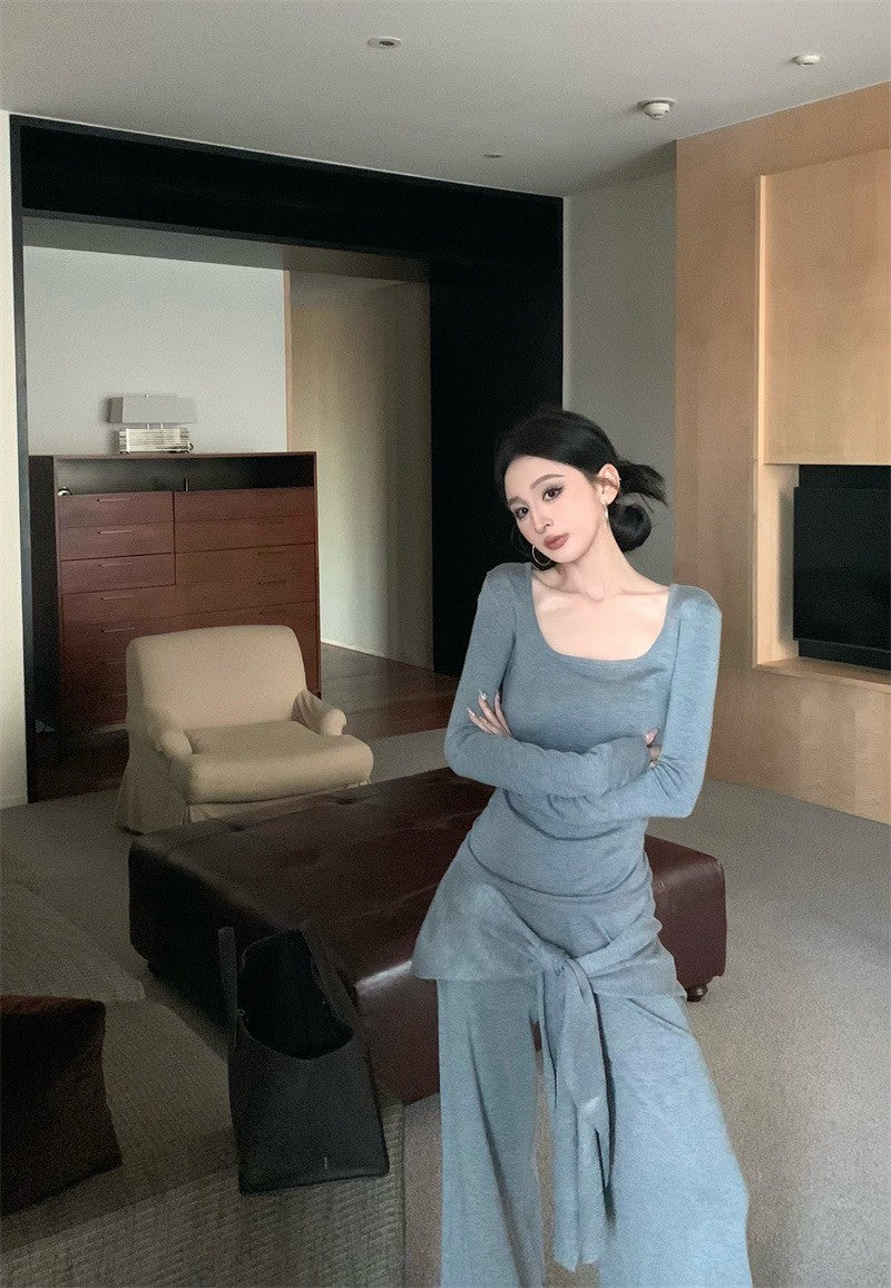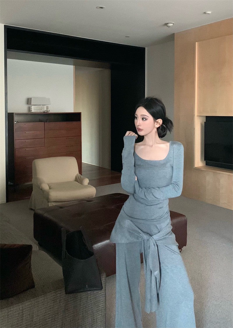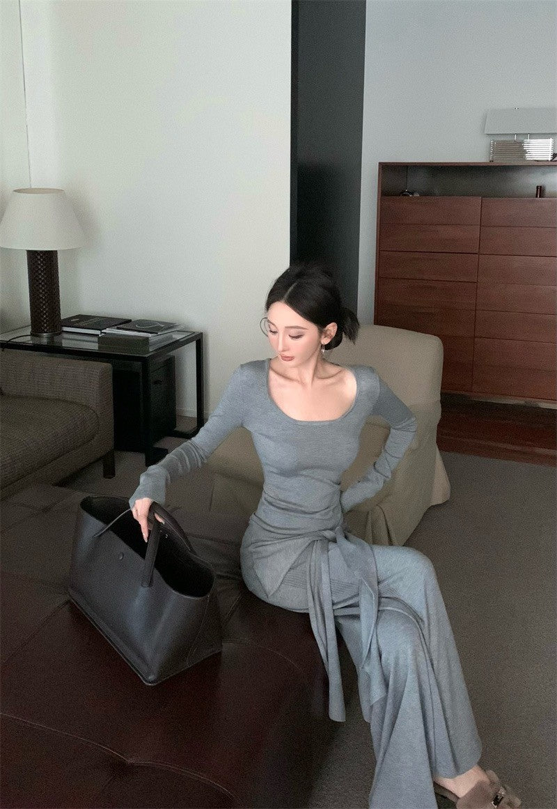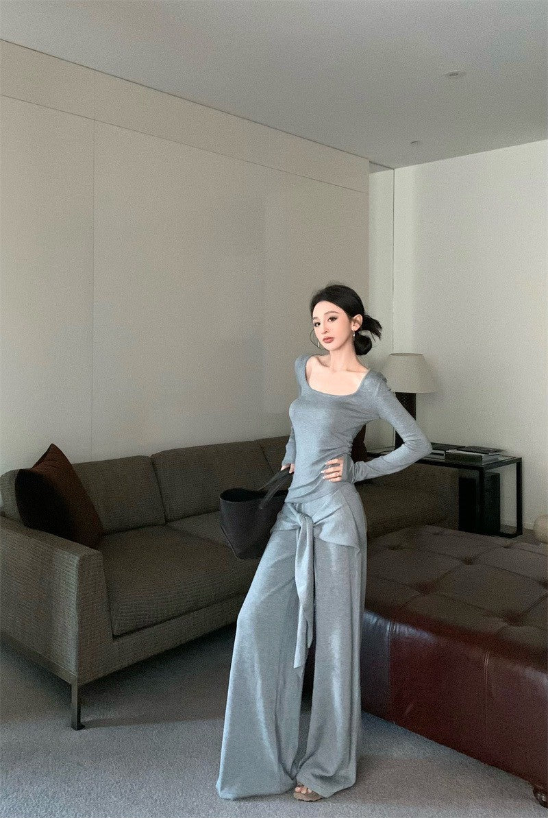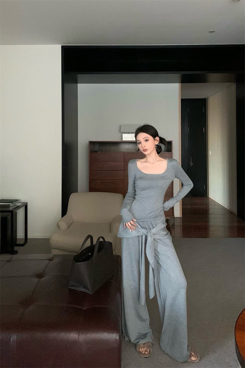 May. Lu系紙片系列 大U領上衣假兩件式綁帶休閒褲套裝 灰